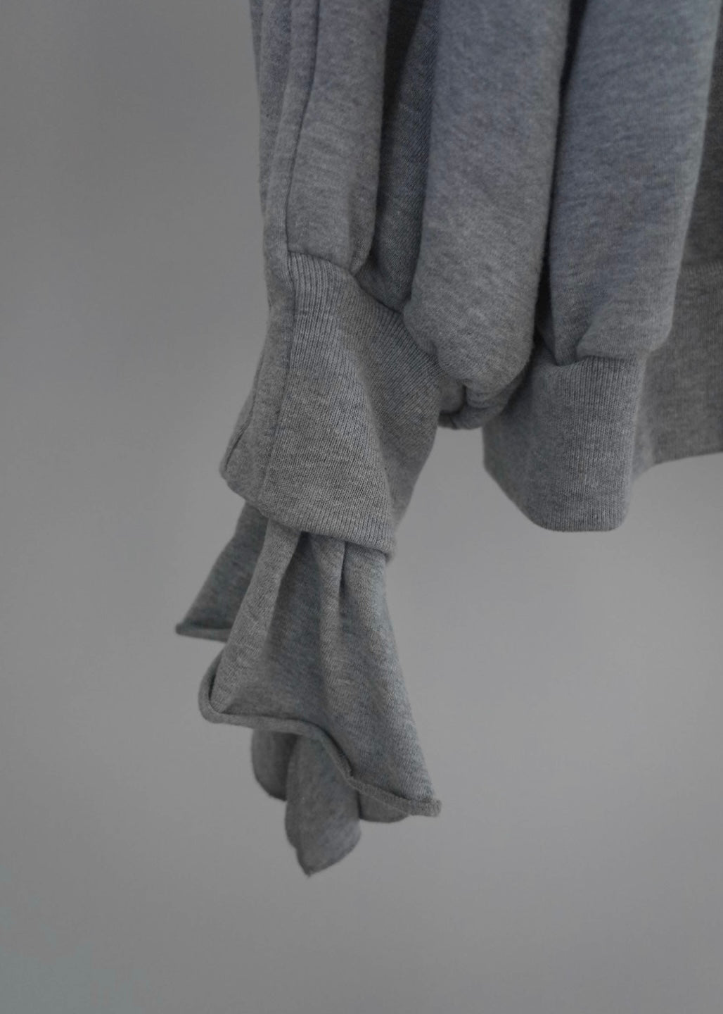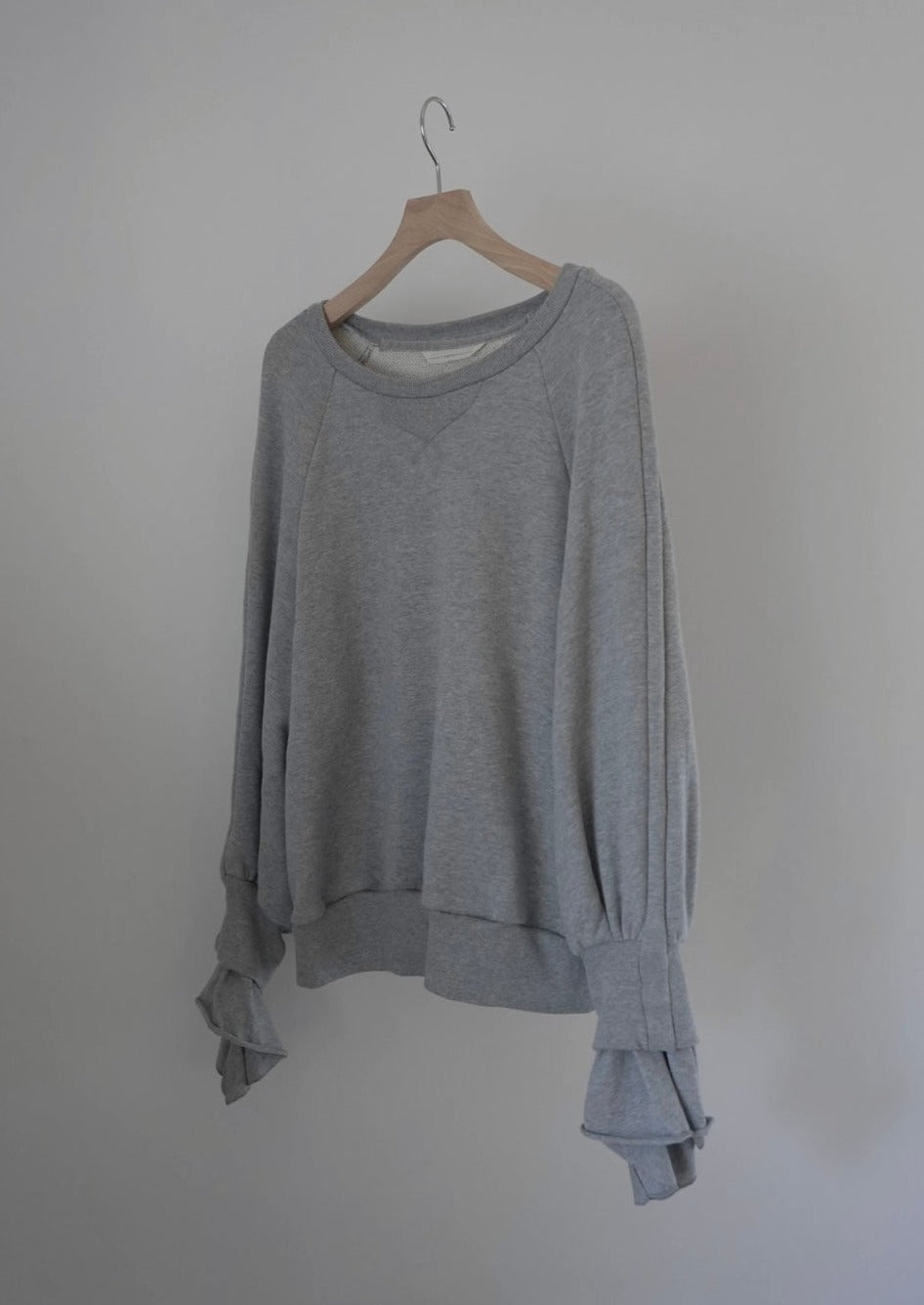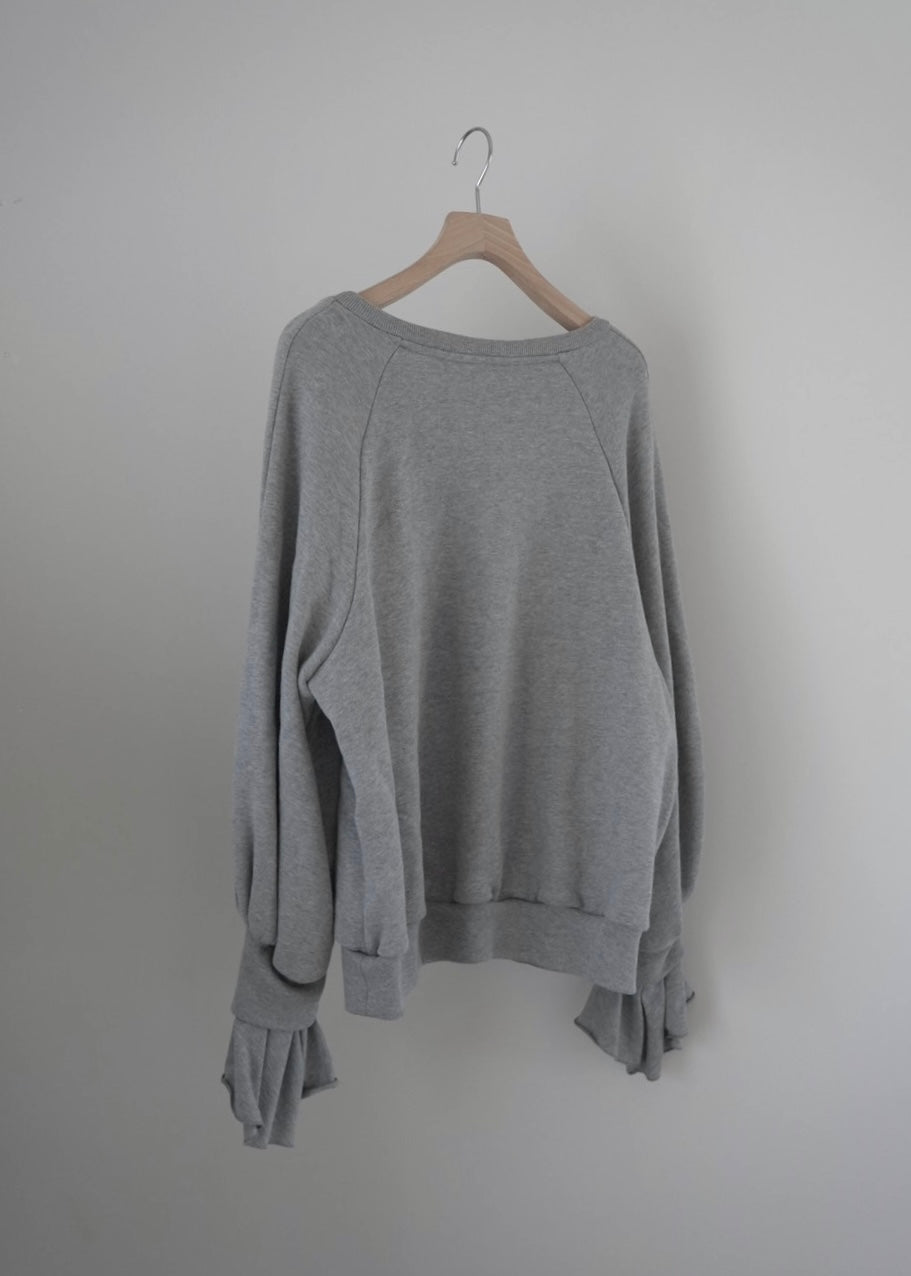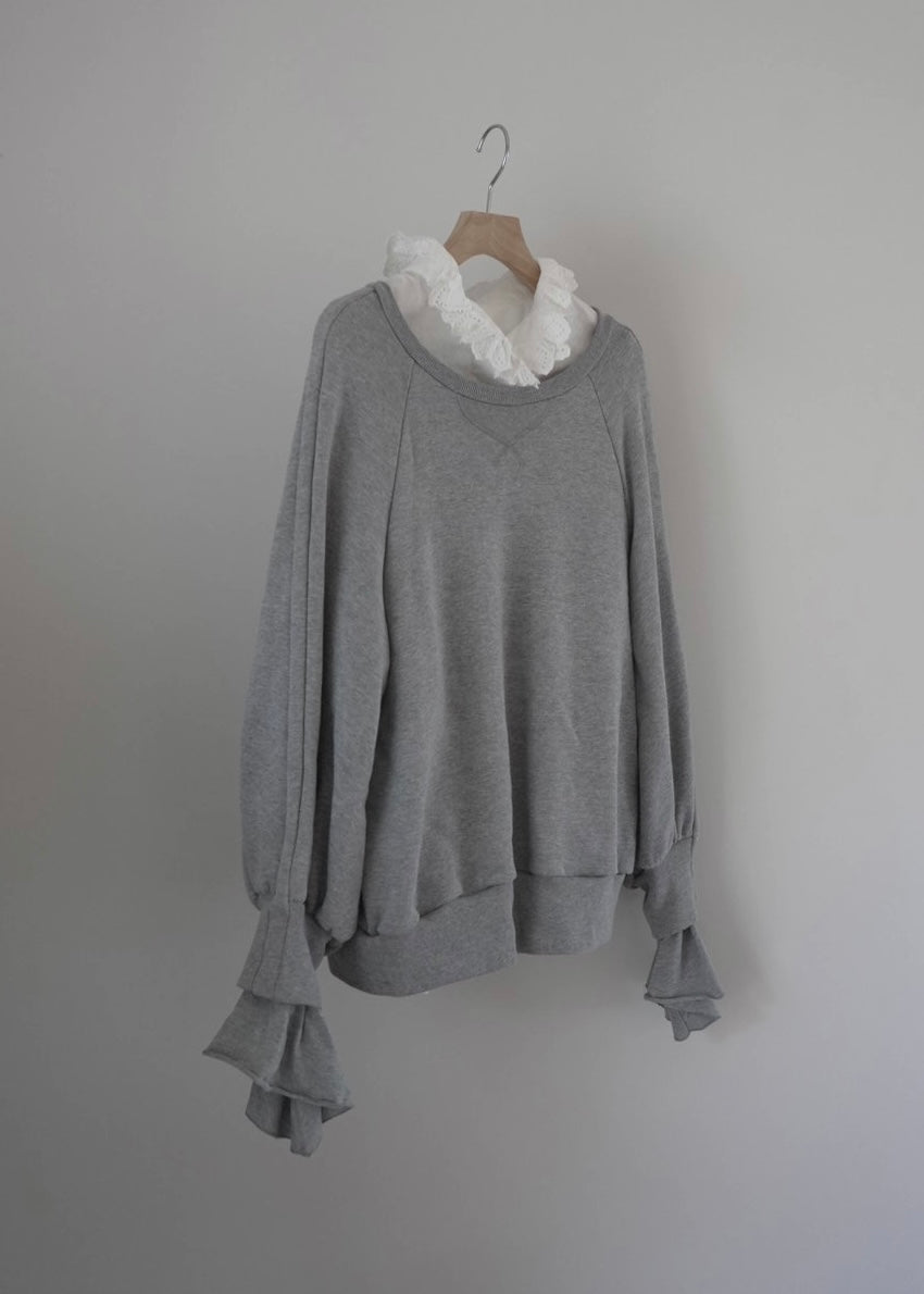 ベーシックな裏毛素材で袖から溢れるフリルが印象的なプルオーバーを仕立てました。