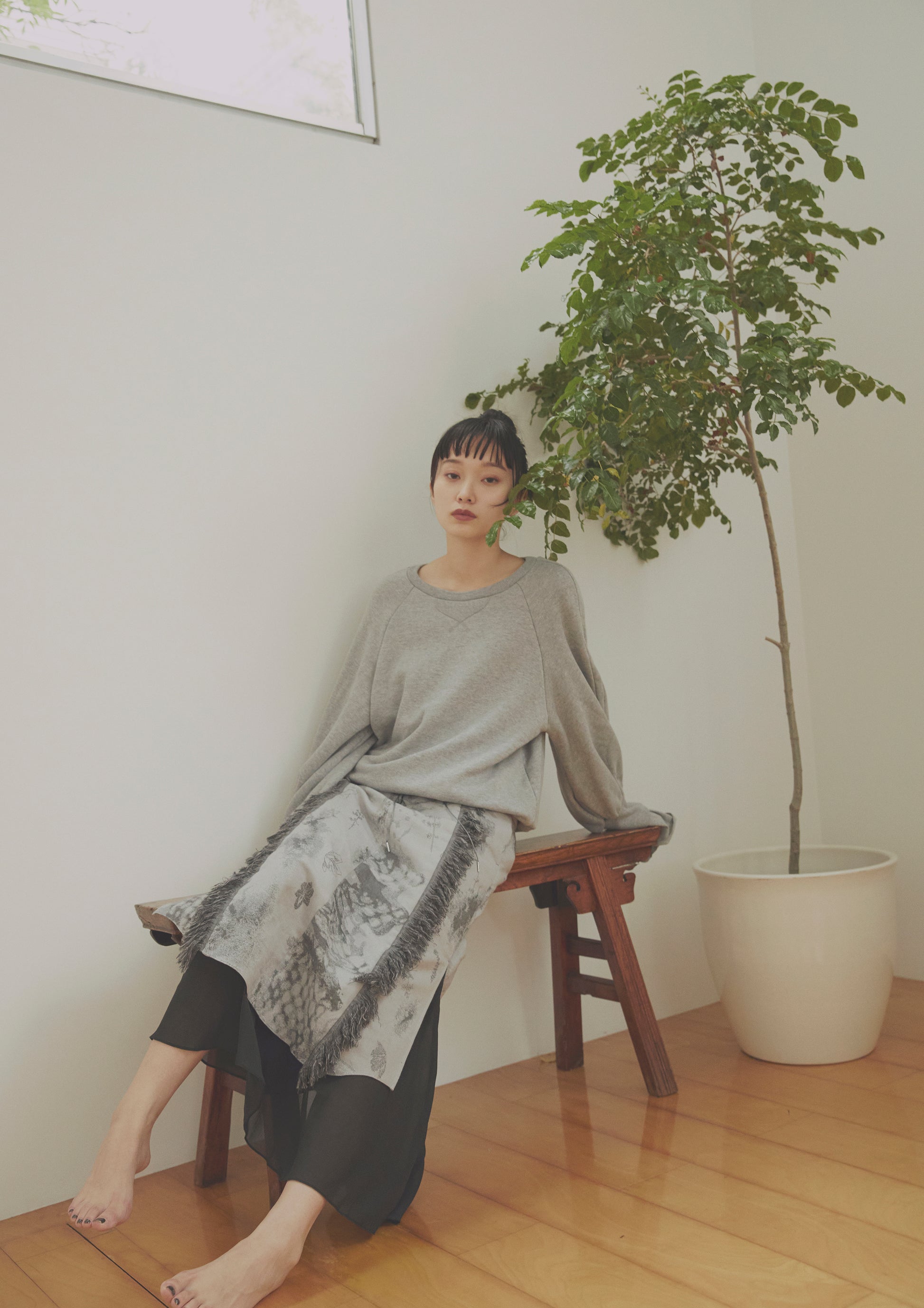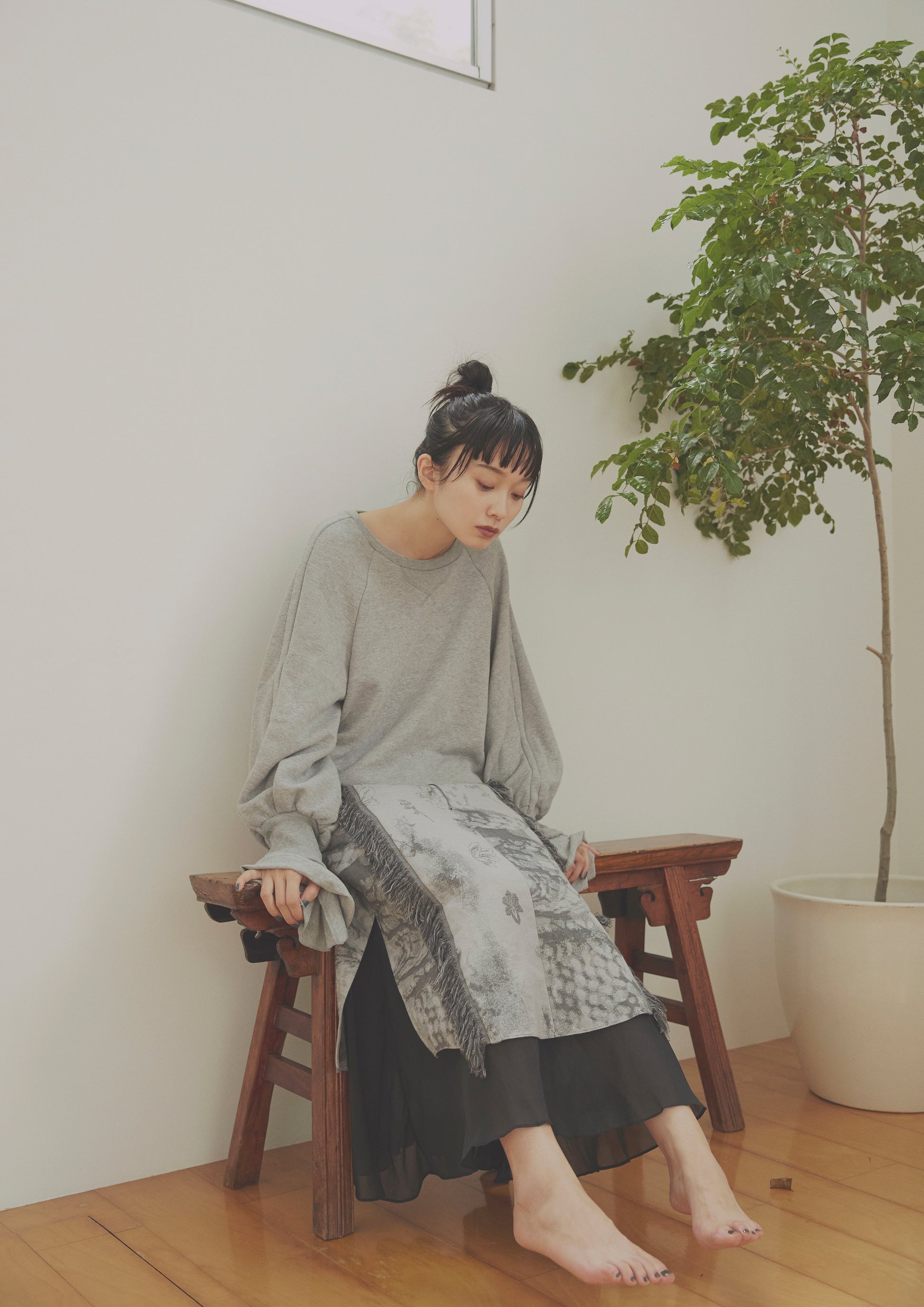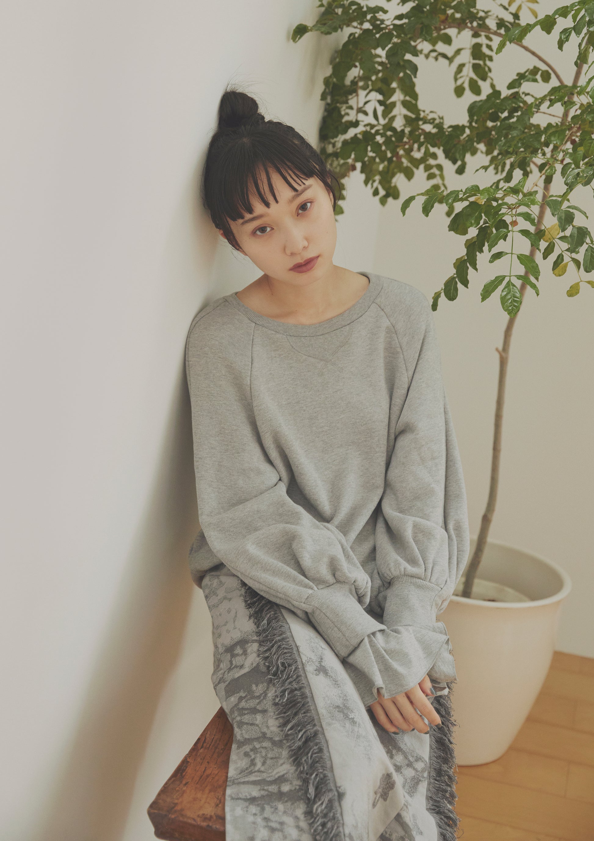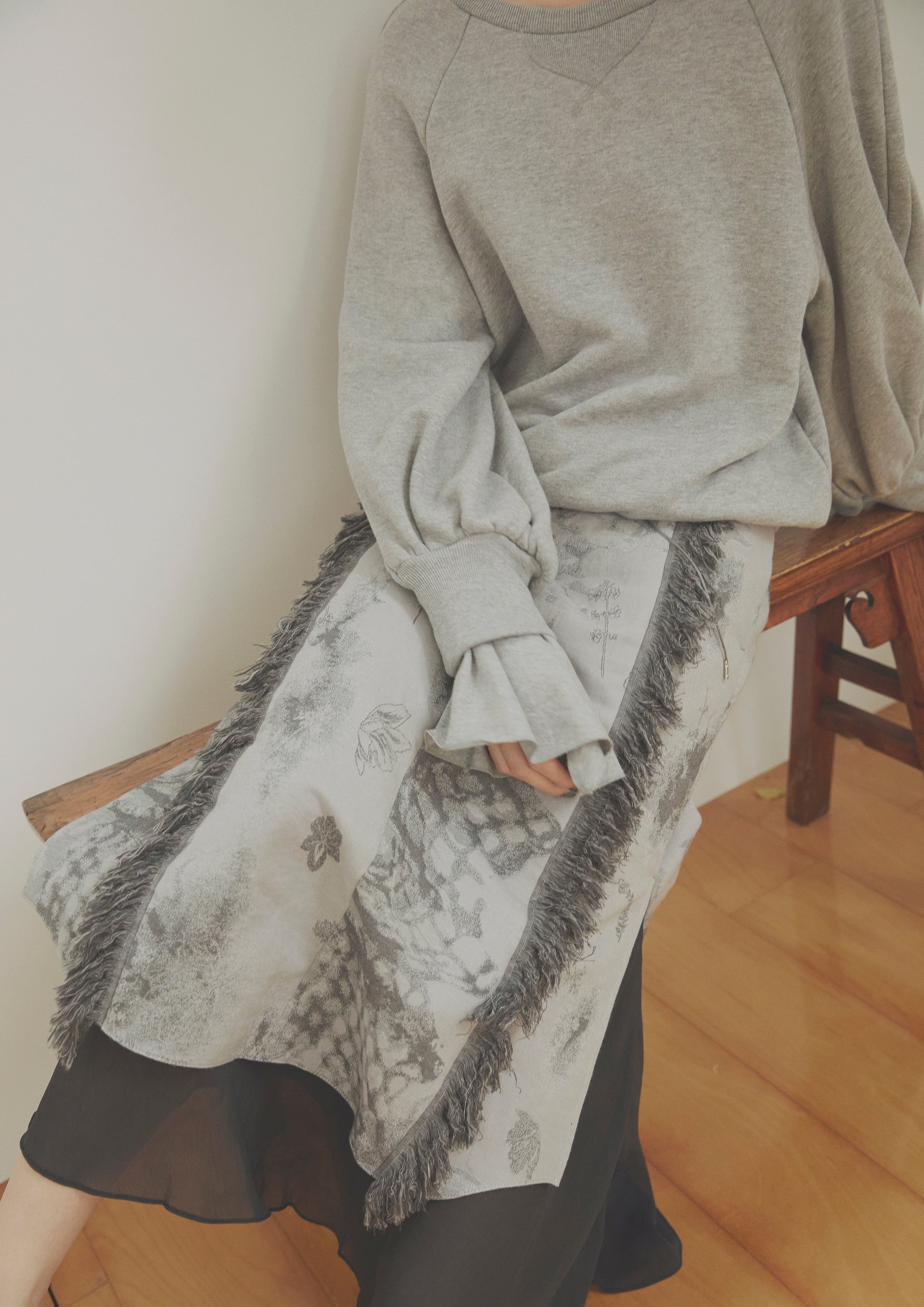 ベーシックな裏毛素材で袖から溢れるフリルが印象的なプルオーバーを仕立てました。