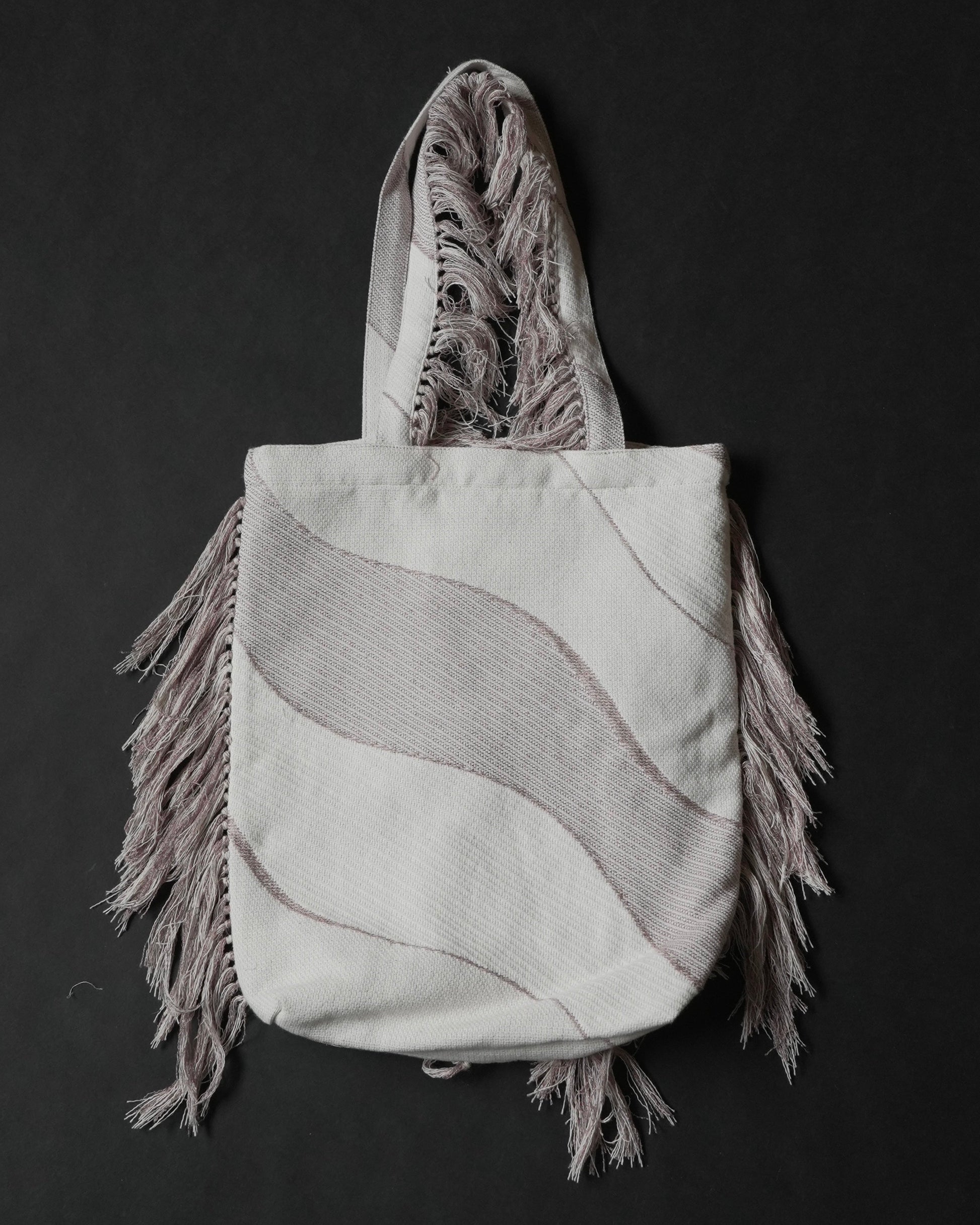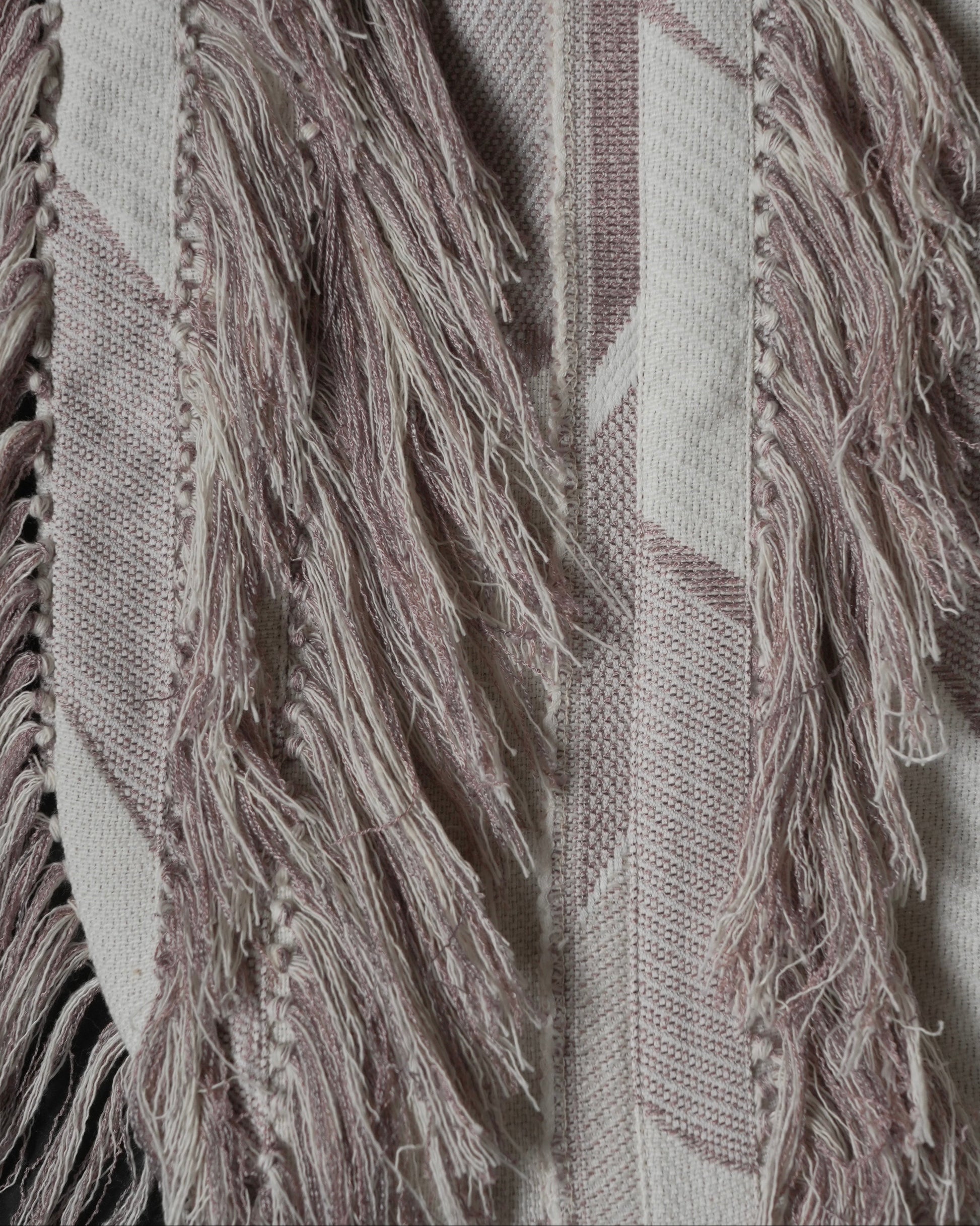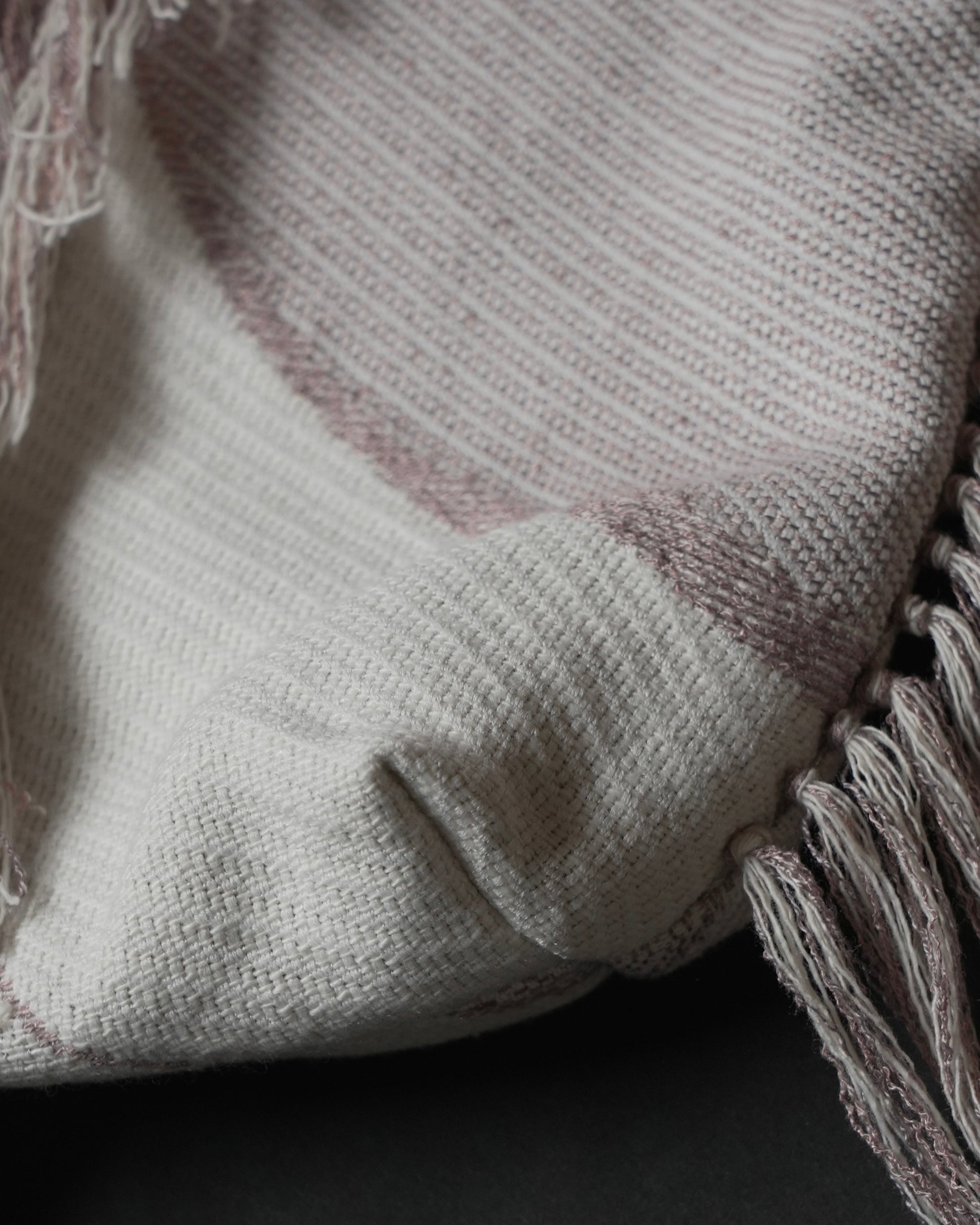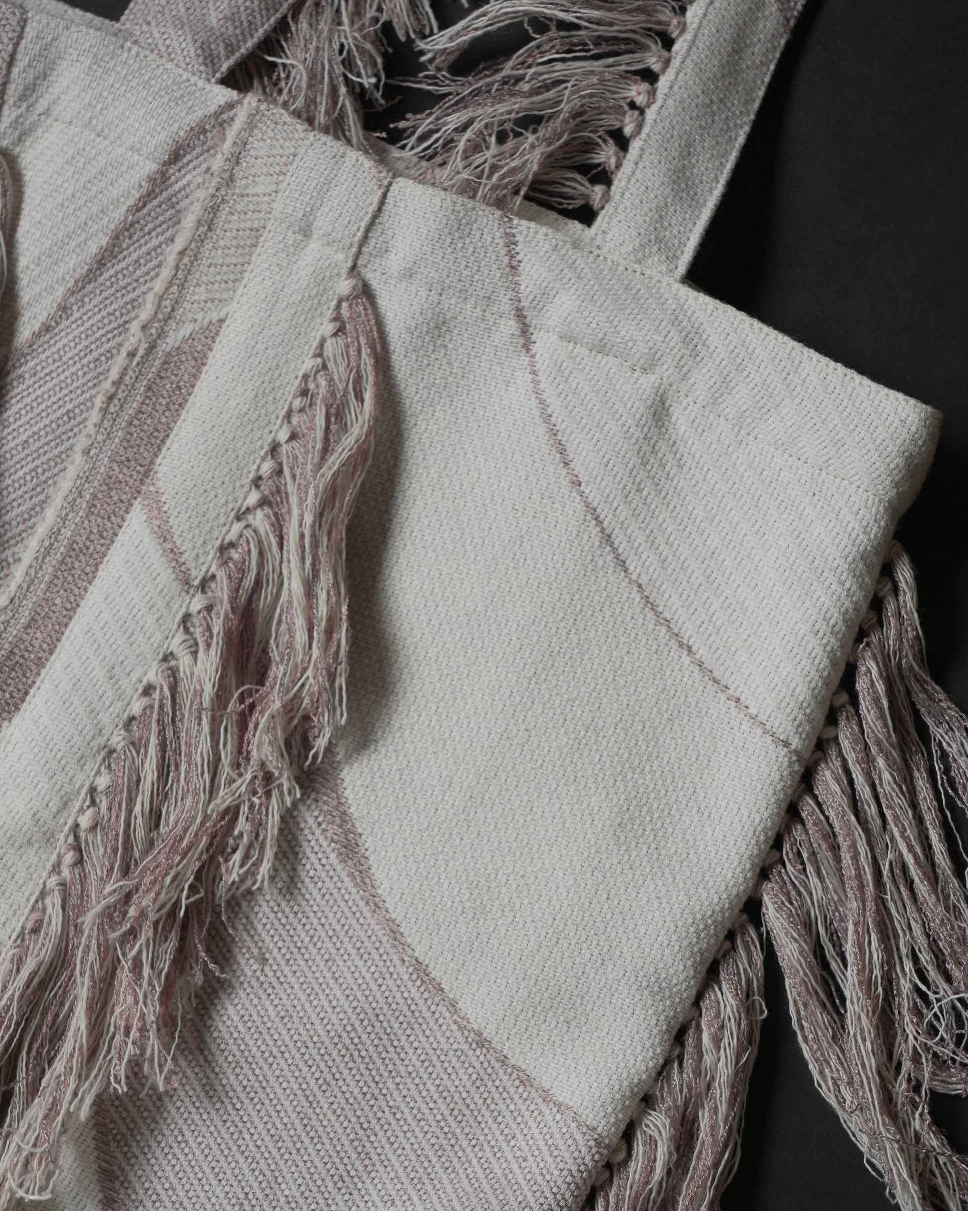 フリンジ部分は、経糸を一本ずつ抜き、横糸を束ねながら手作業で仕上げています。