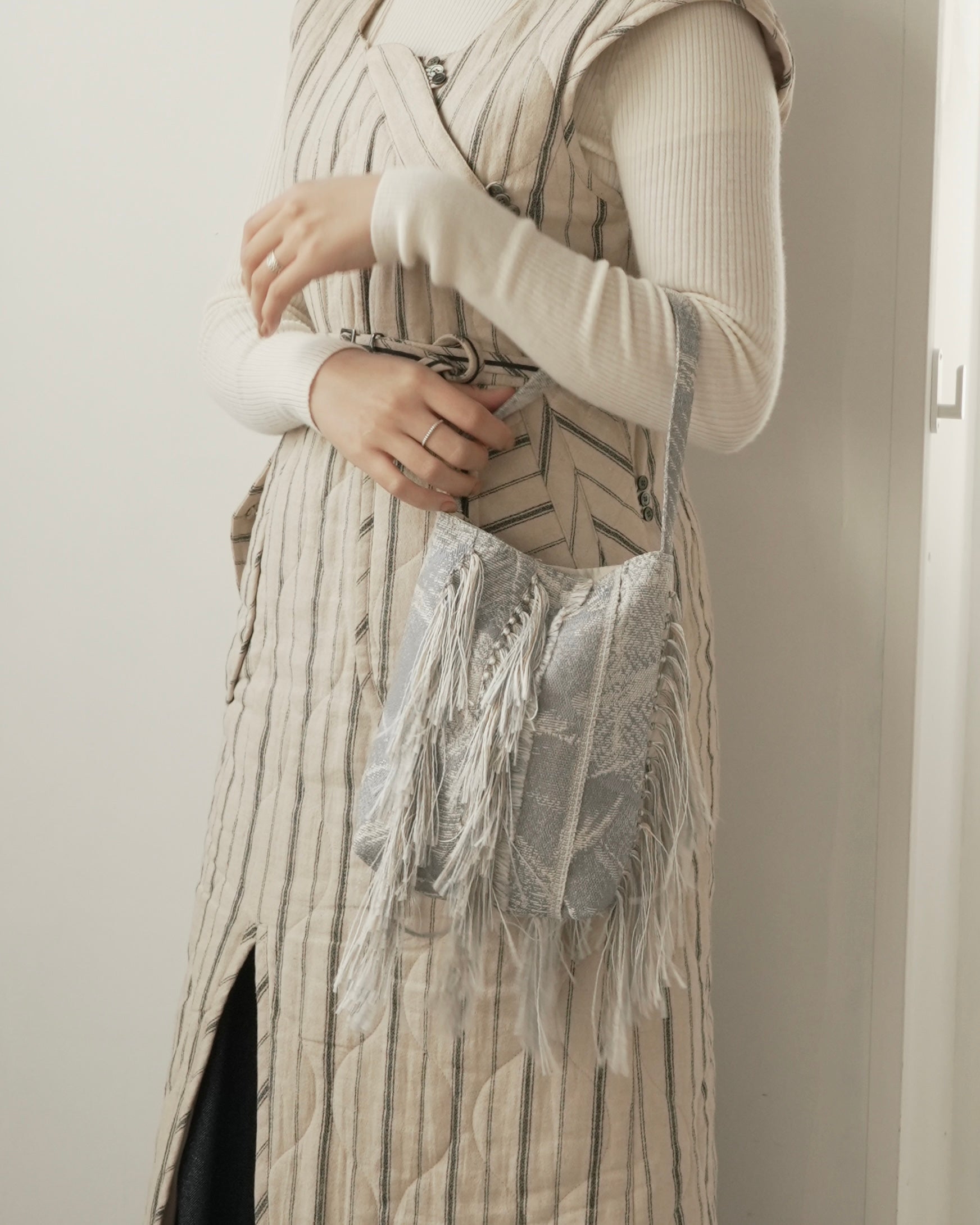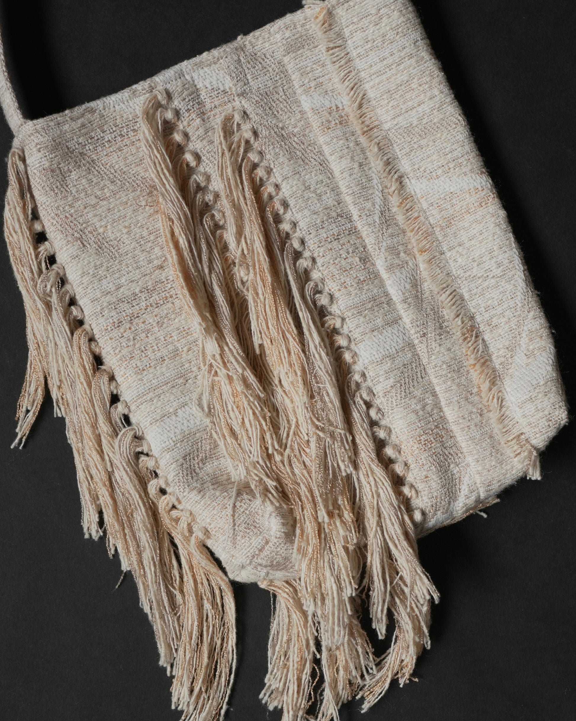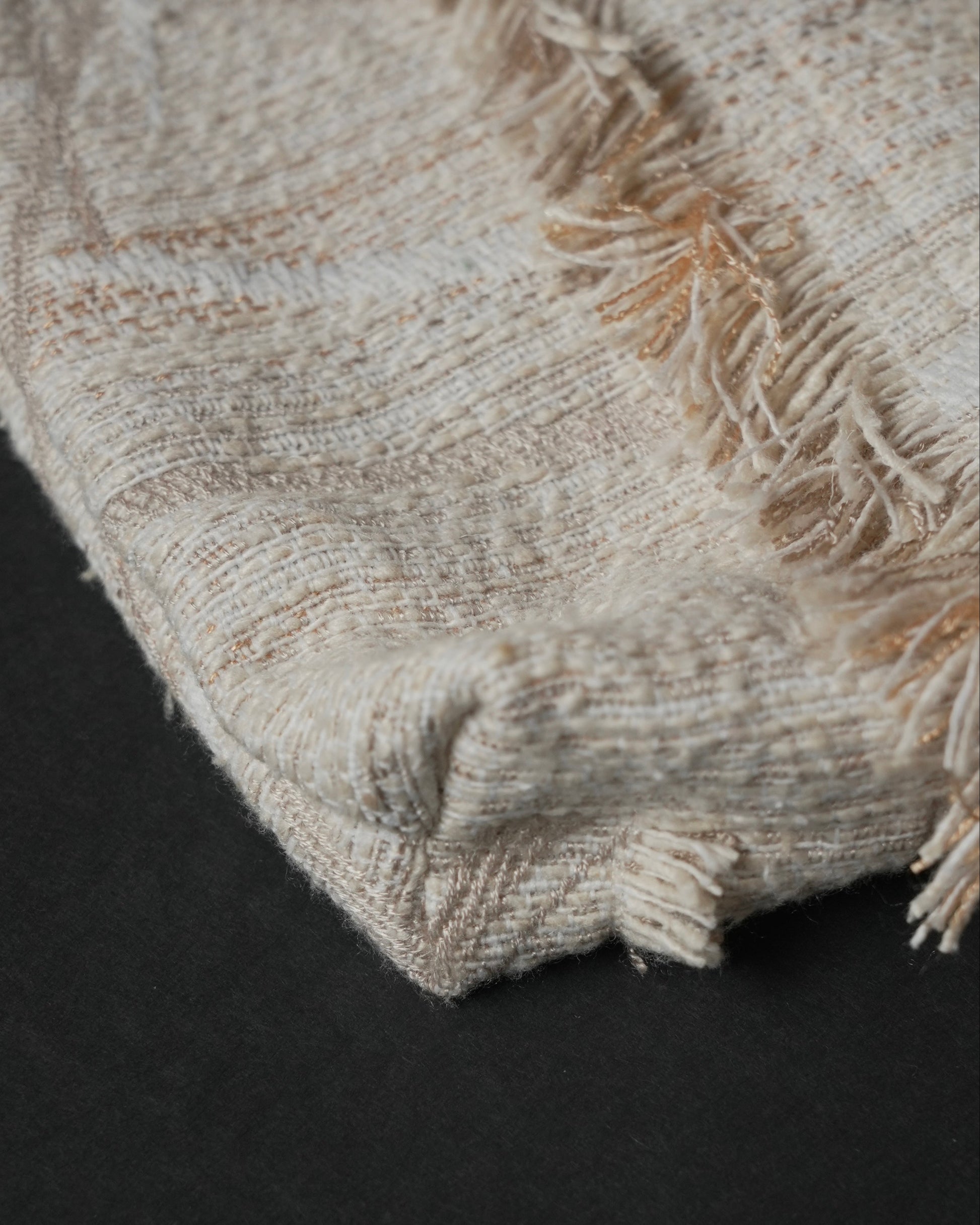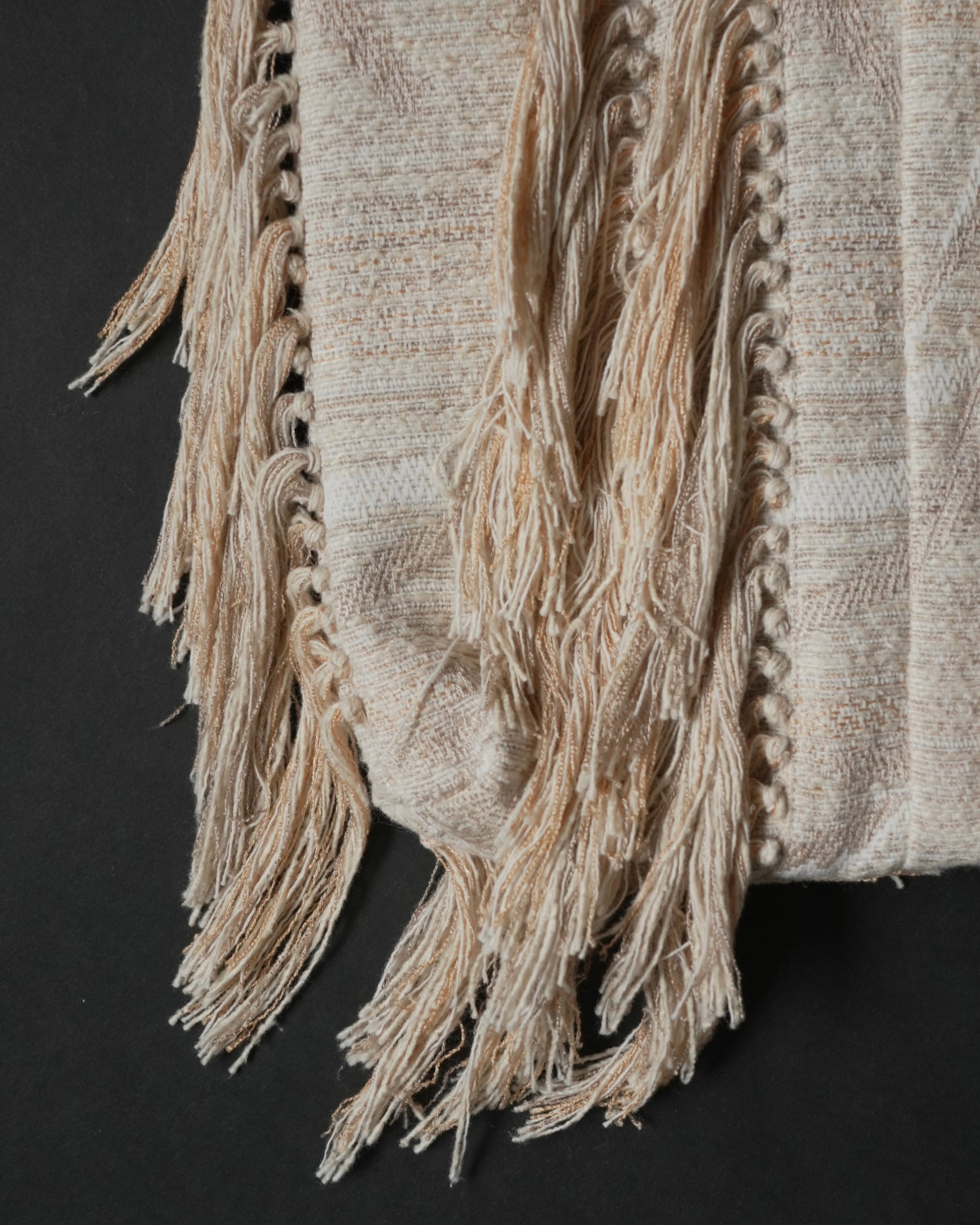 フリンジ部分は、経糸を一本ずつ抜き、横糸を束ねながら手作業で仕上げています。