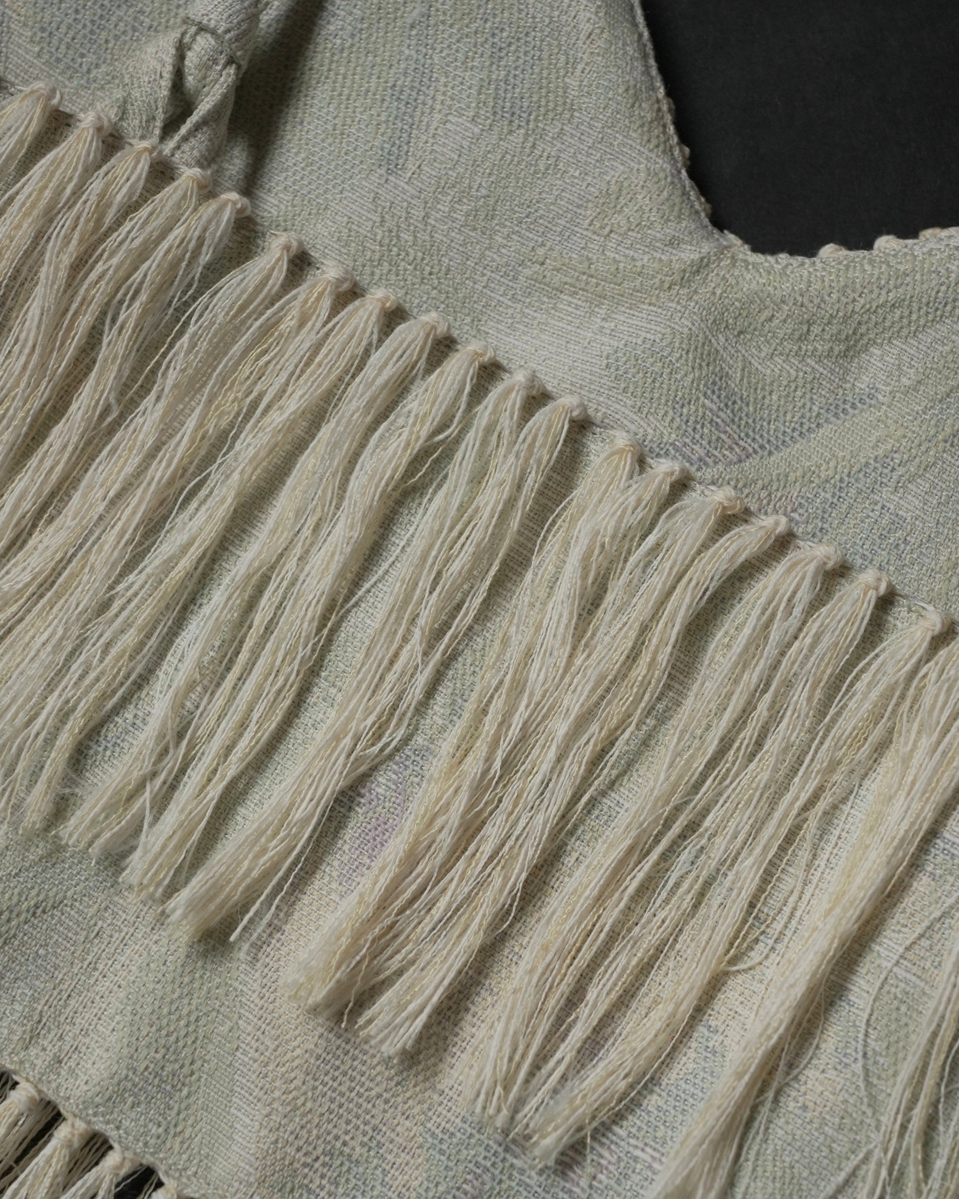 フリンジ部分は、経糸を一本ずつ抜き、横糸を束ねながら手作業で仕上げています。