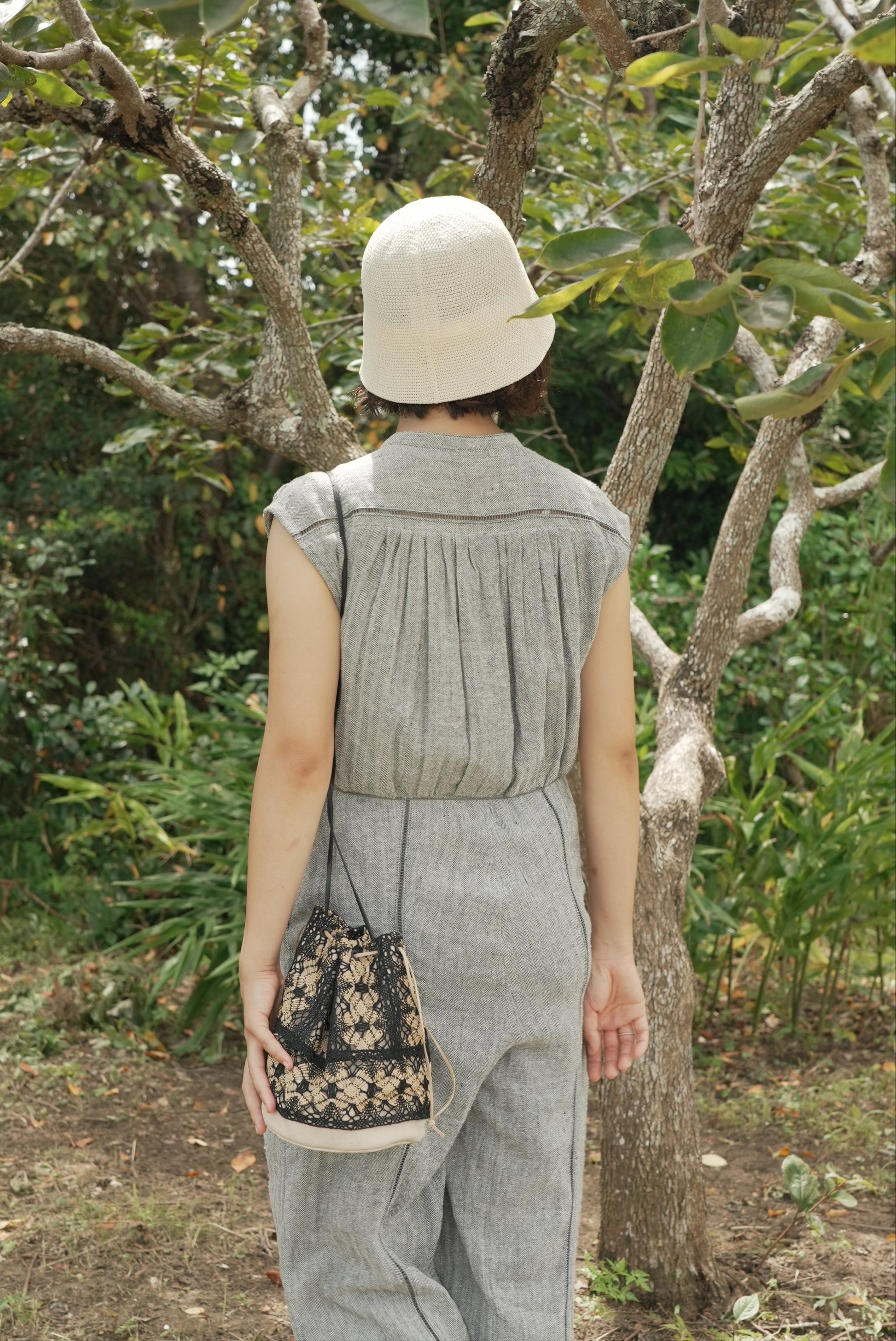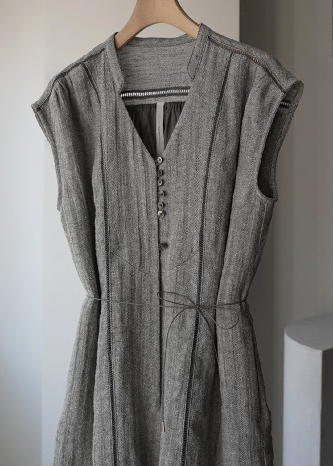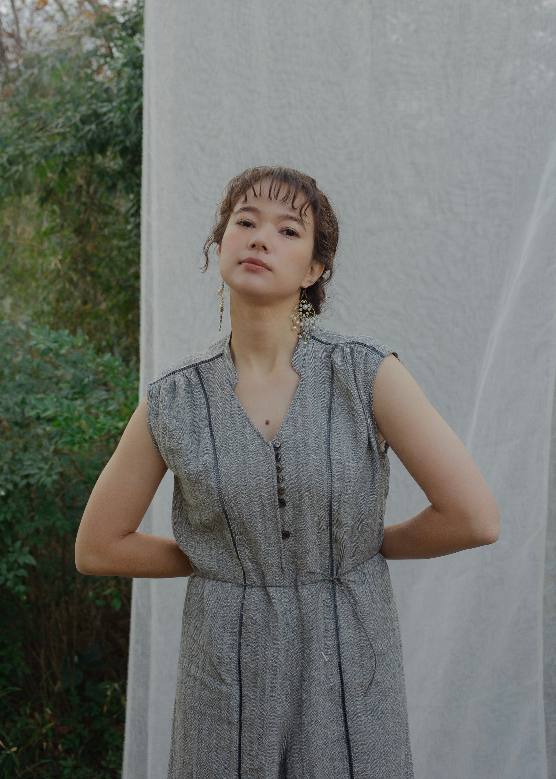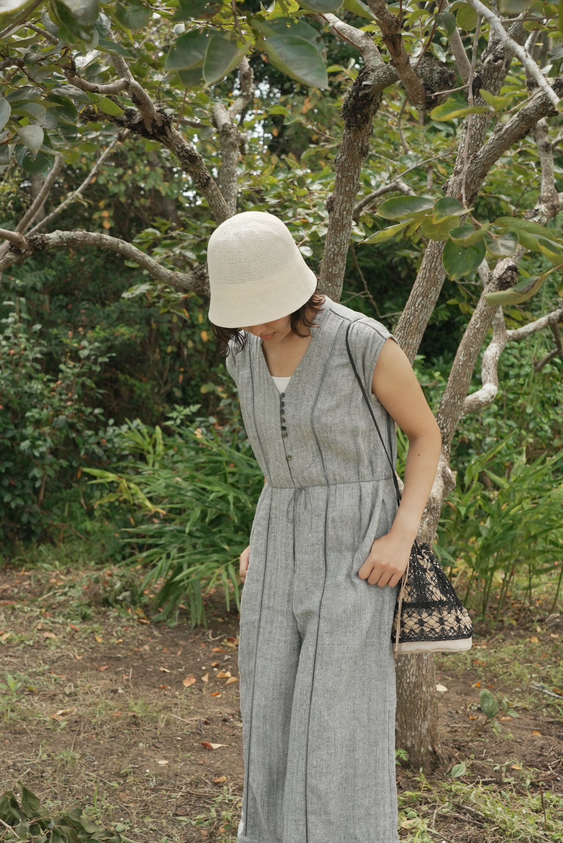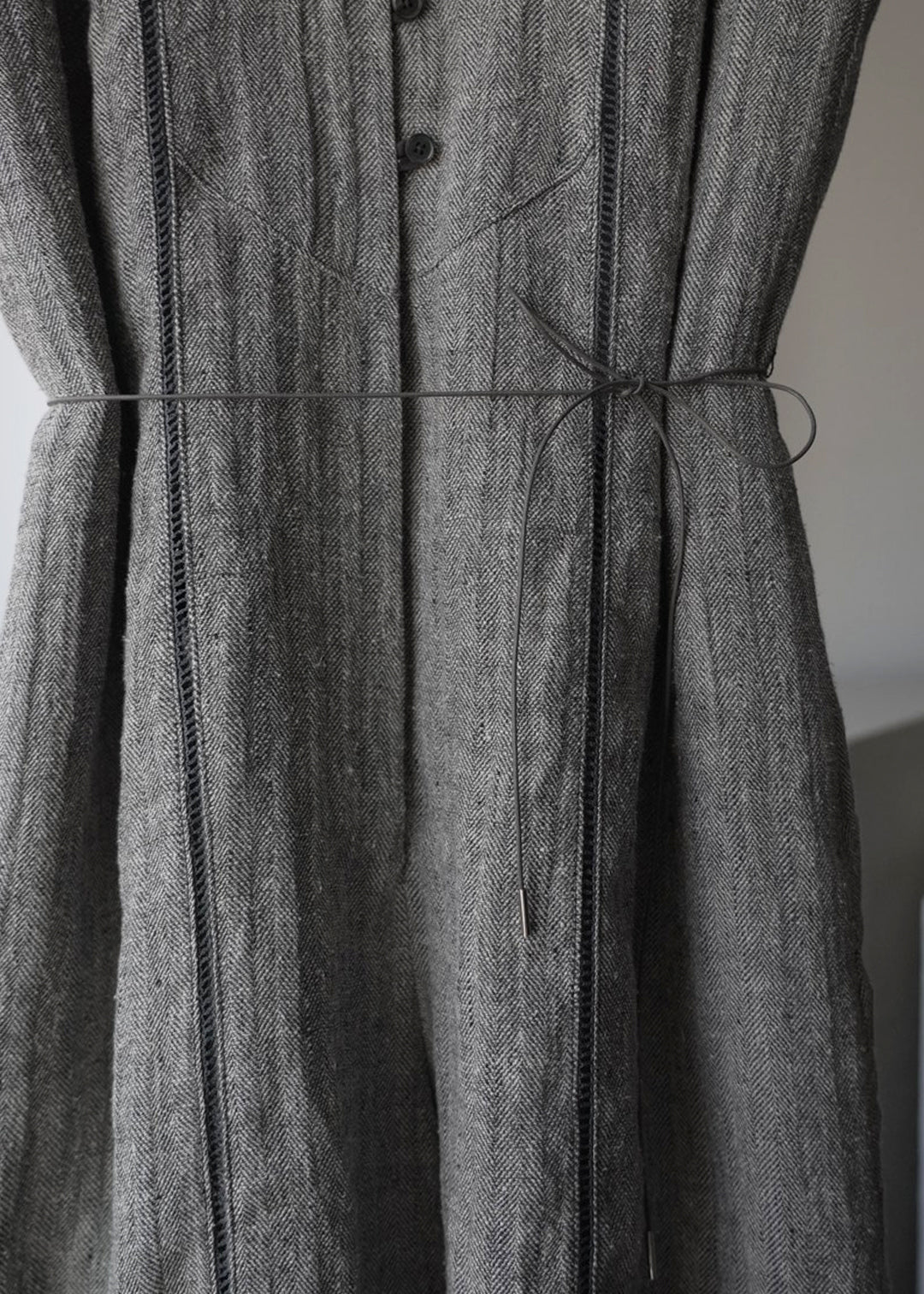 這款連身褲採用亞麻線與絲線混合編織而成的人字形材質製成。