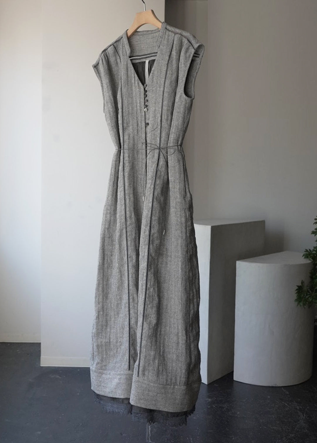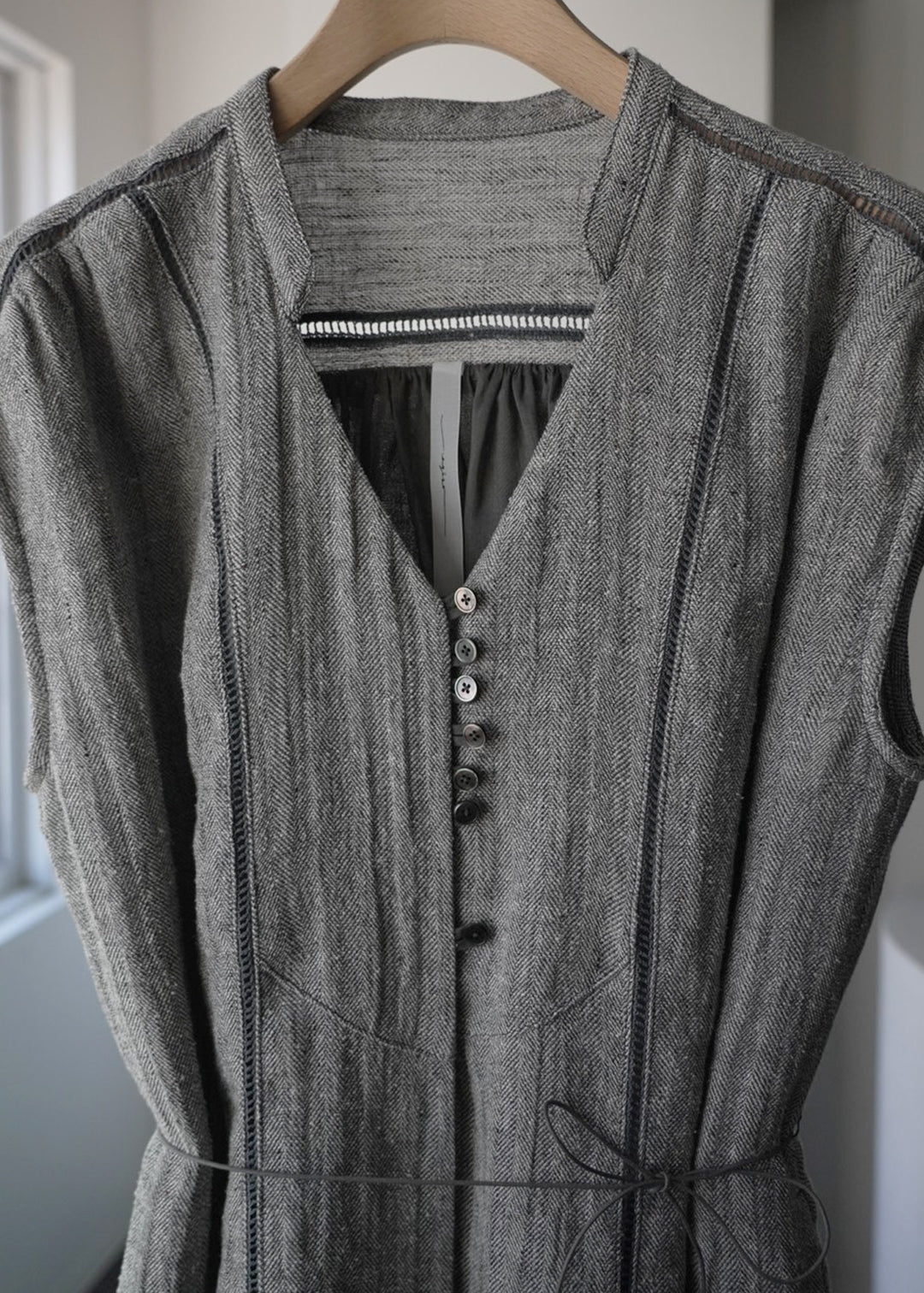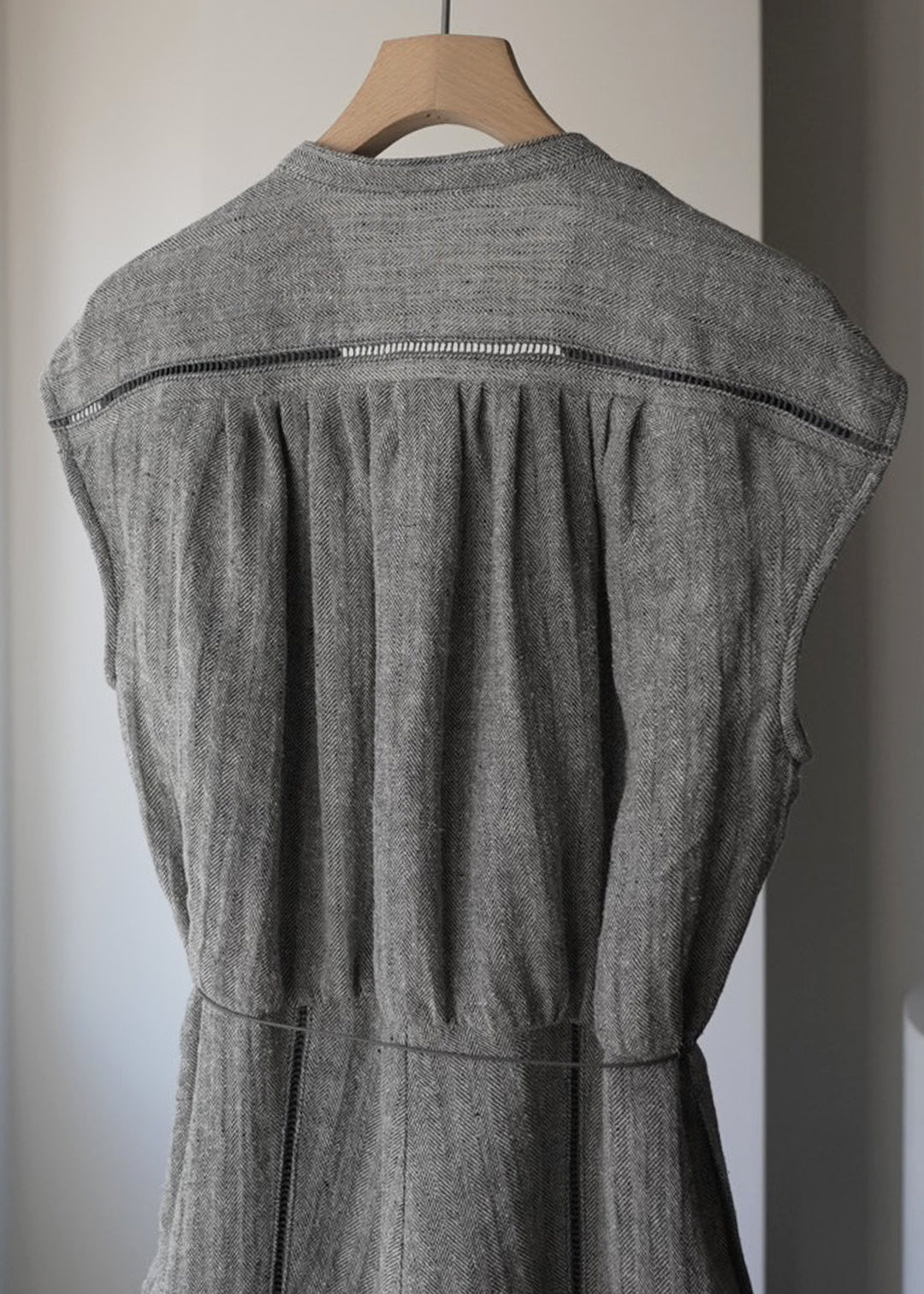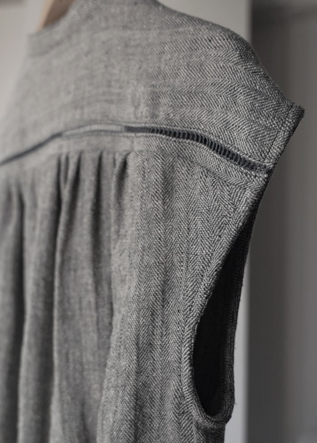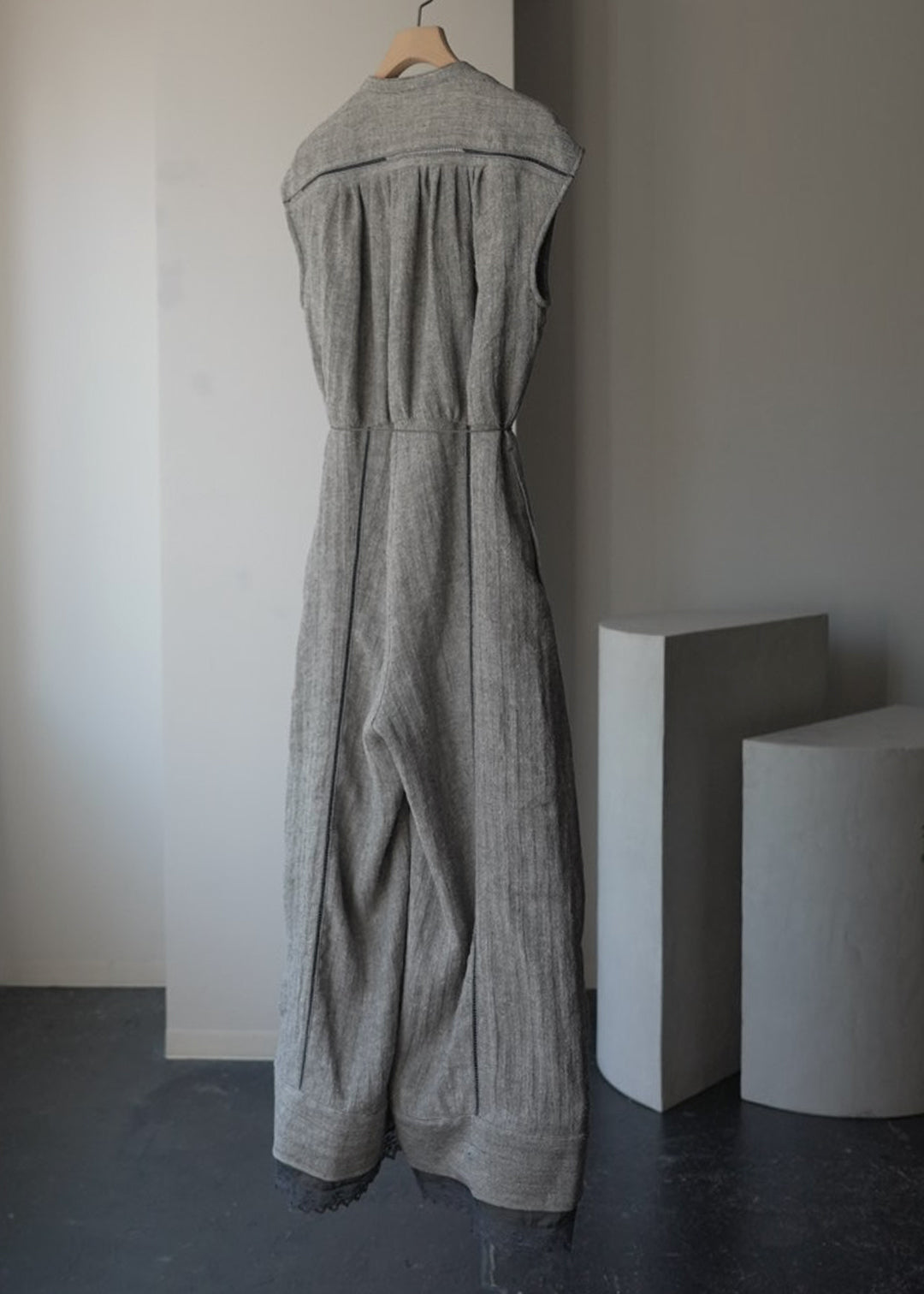 這款連身褲採用亞麻線與絲線混合編織而成的人字形材質製成。