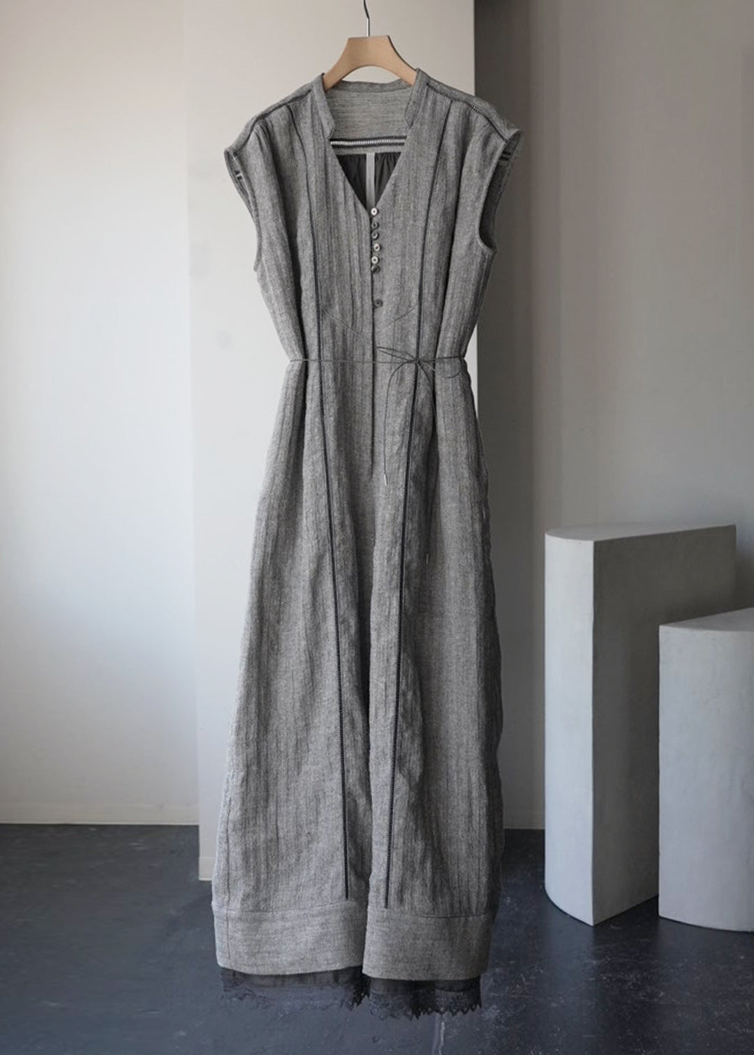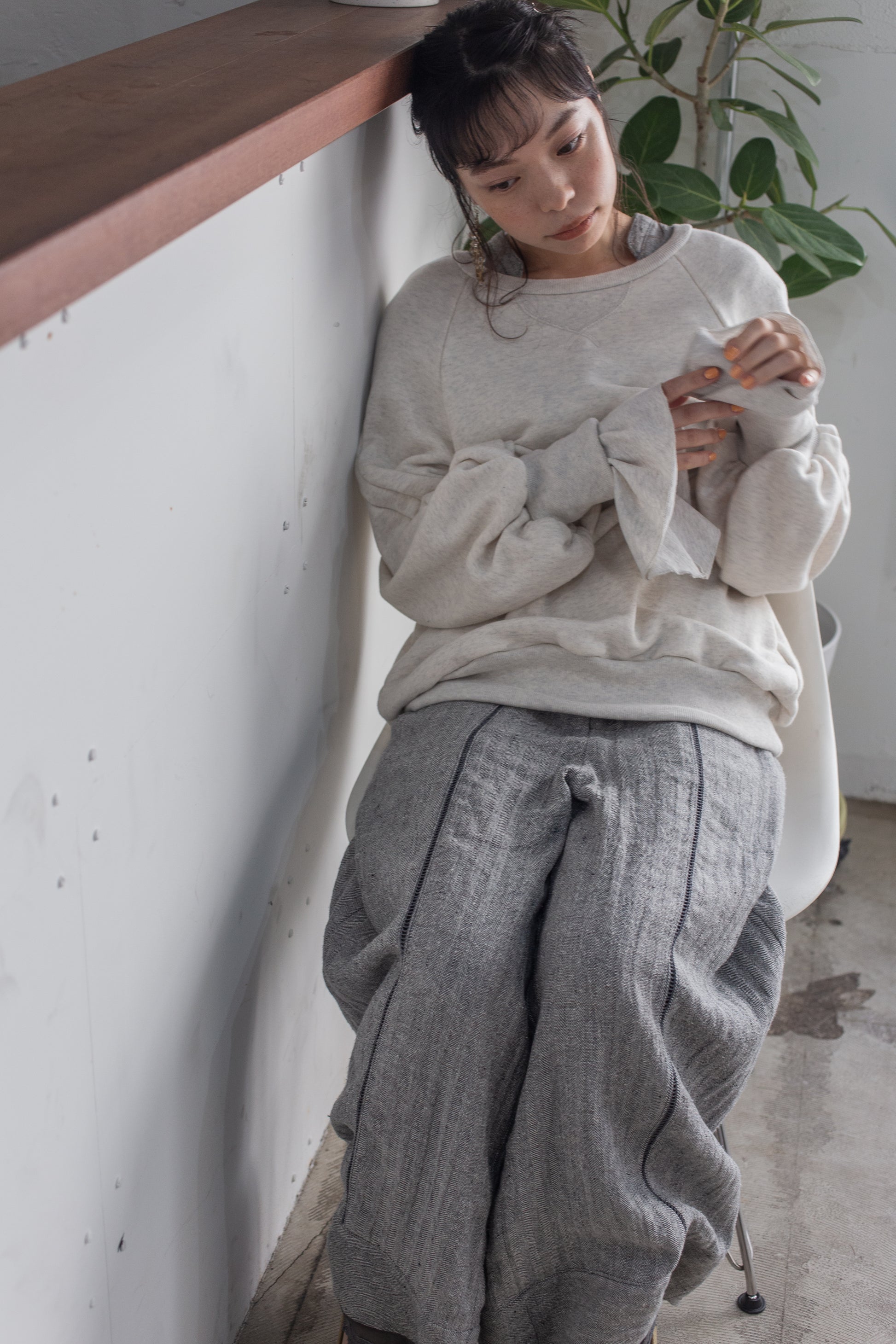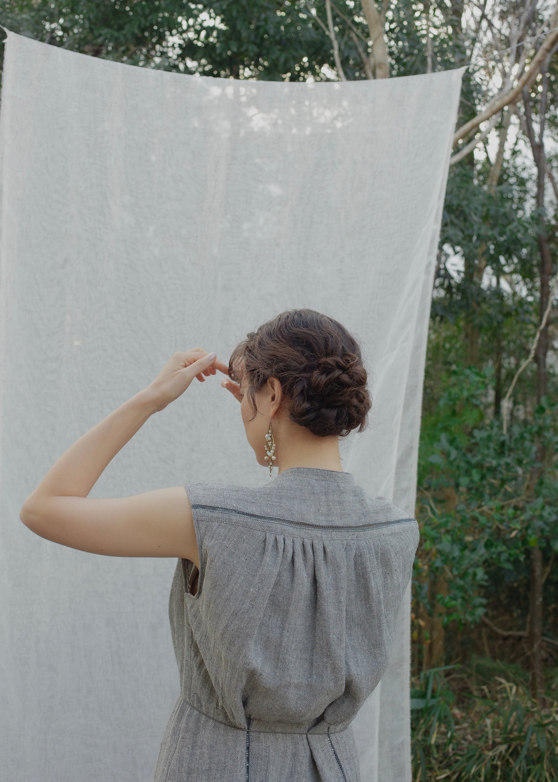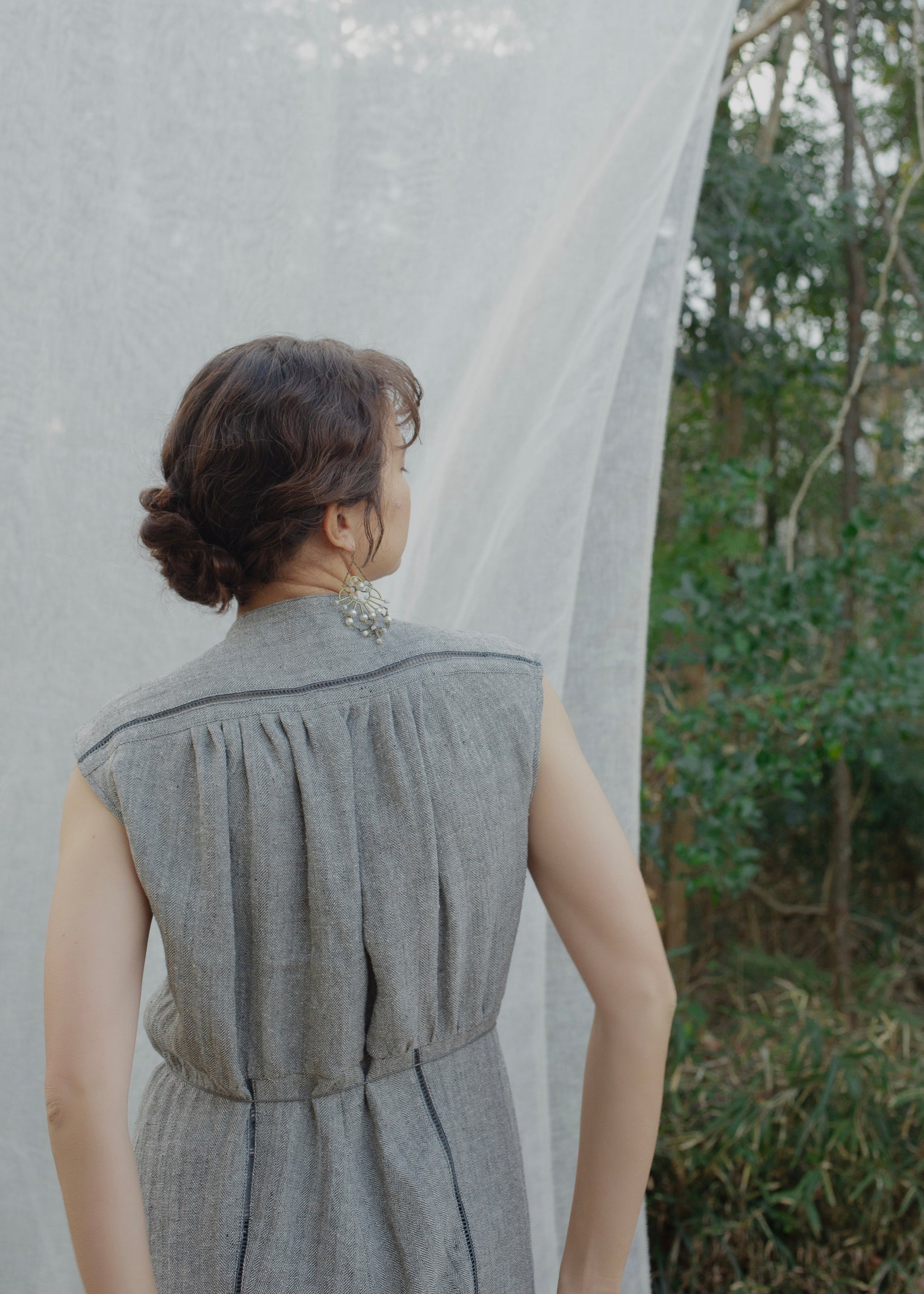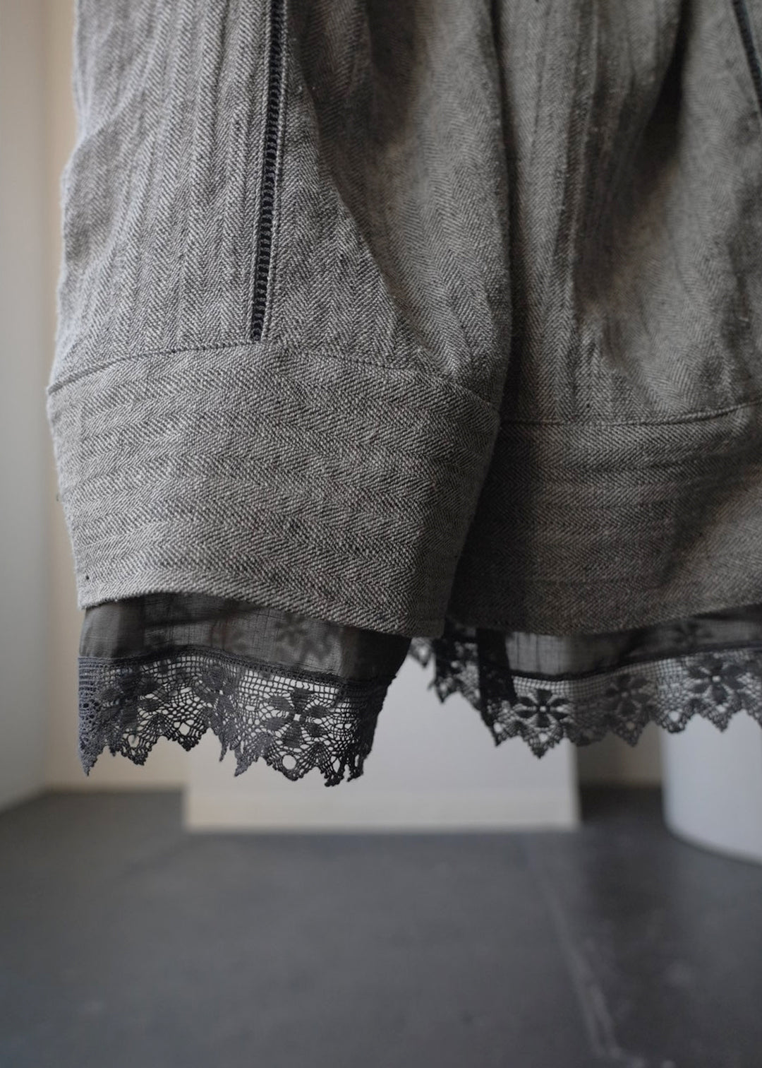這款連身褲採用亞麻線與絲線混合編織而成的人字形材質製成。