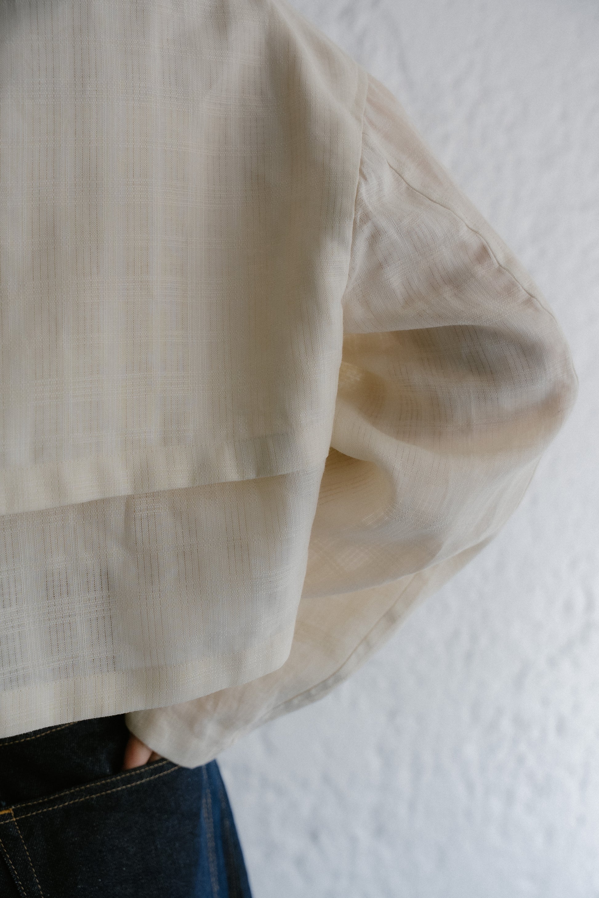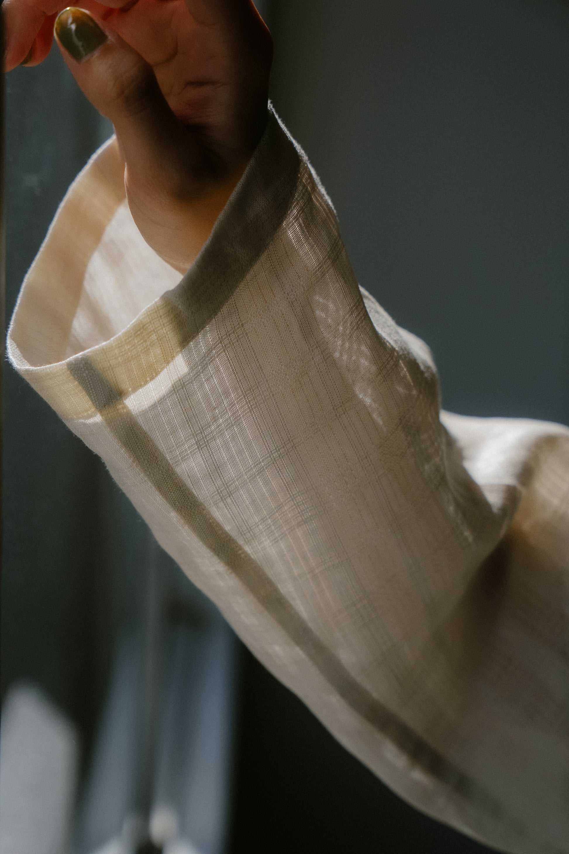 本品採用多臂織造的格紋布料,具有苧麻特有的堅韌質感。經過水洗處理,質感柔軟親膚。