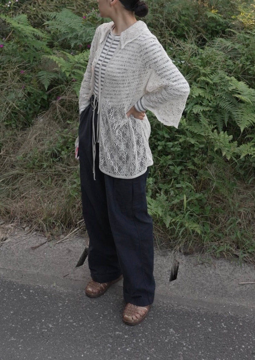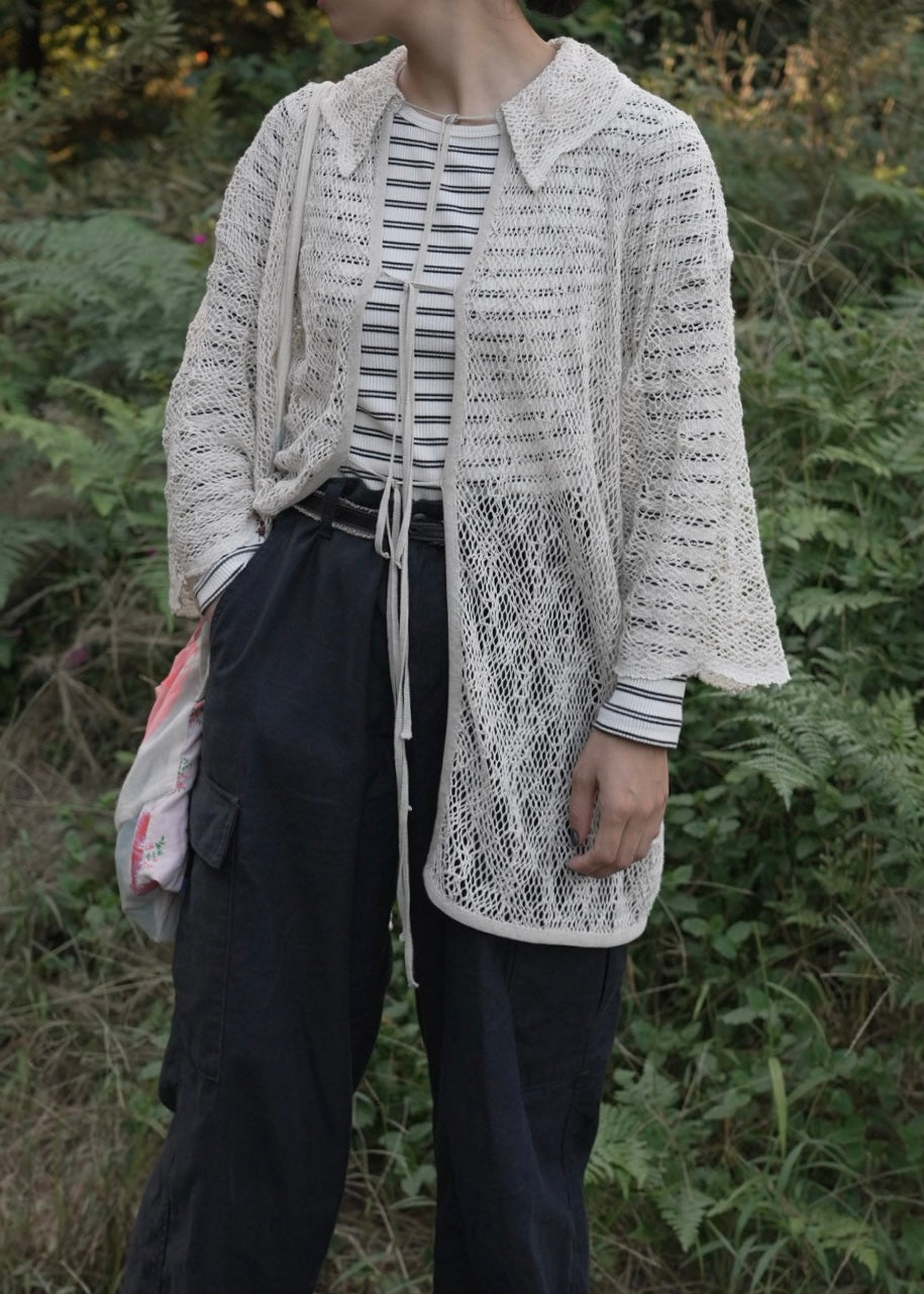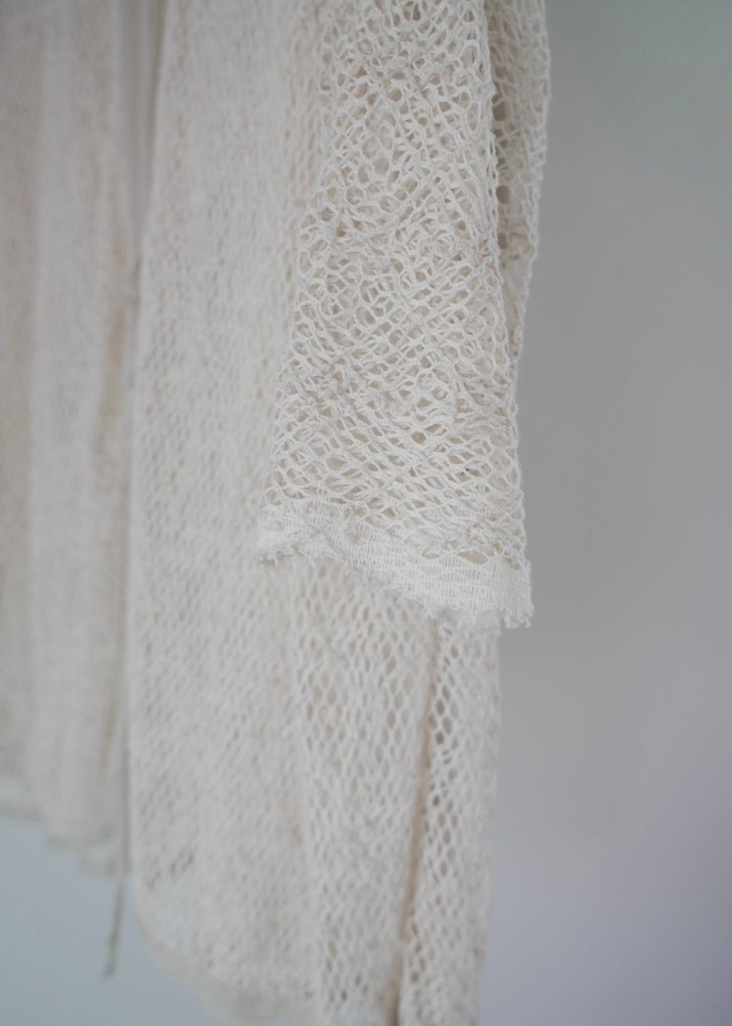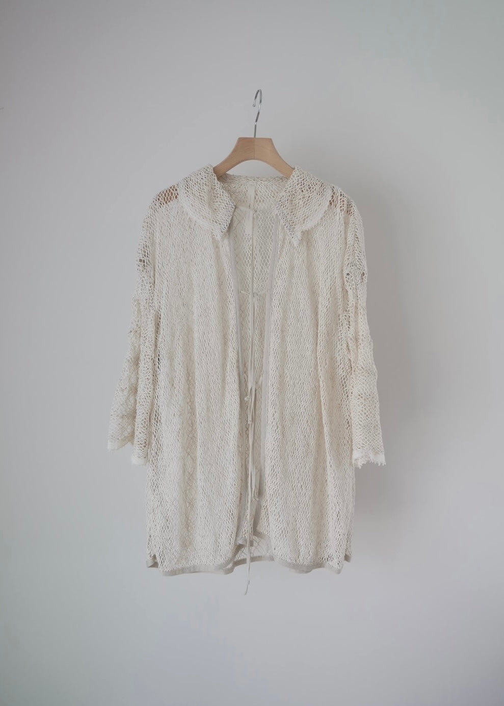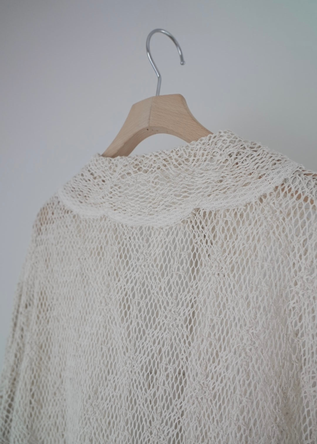 蕾絲採用不同粗細的紗線編織而成,賦予其棉麻獨有的自然紋理和立體感。衣領和袖口飾有手工切割的扇貝花邊。