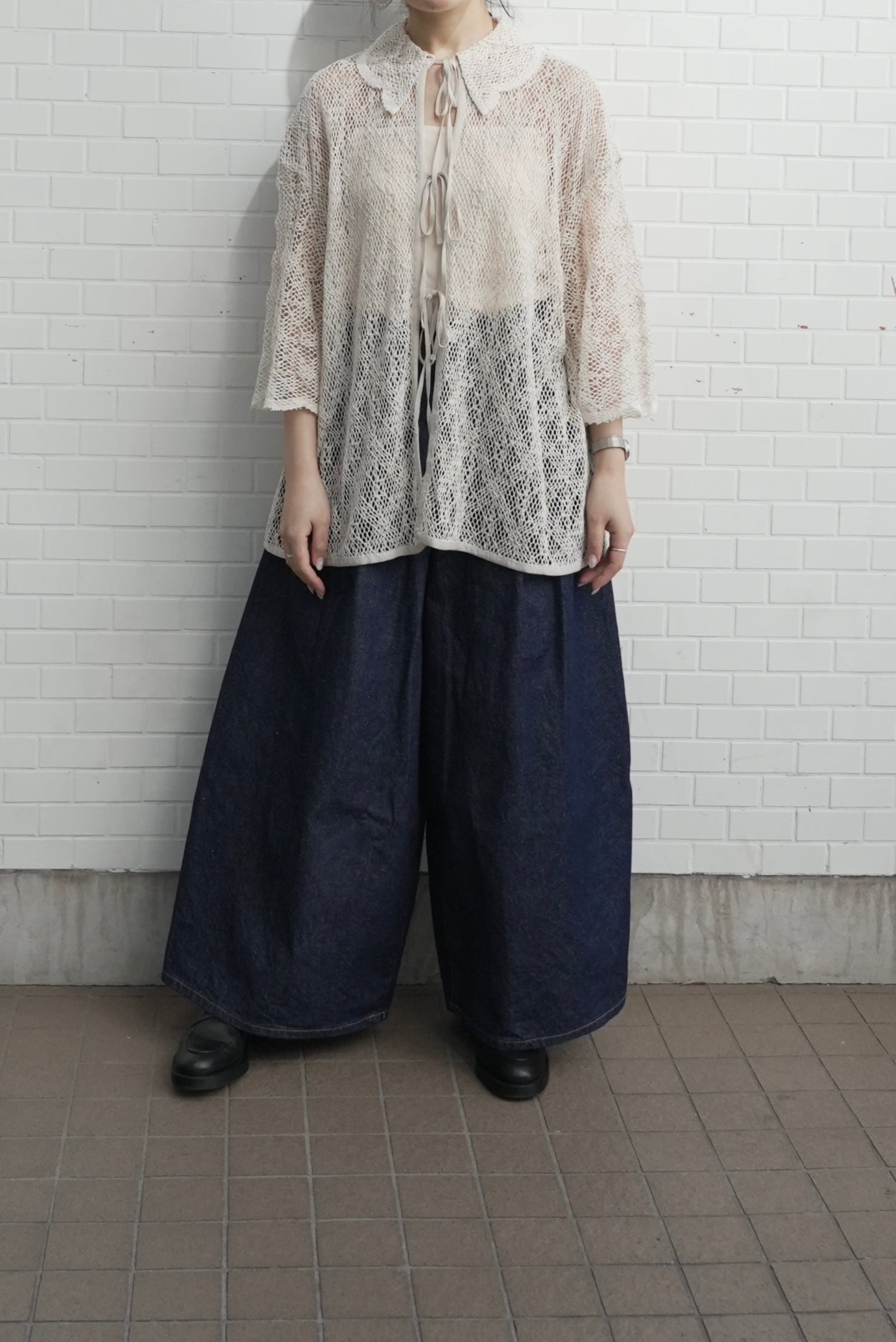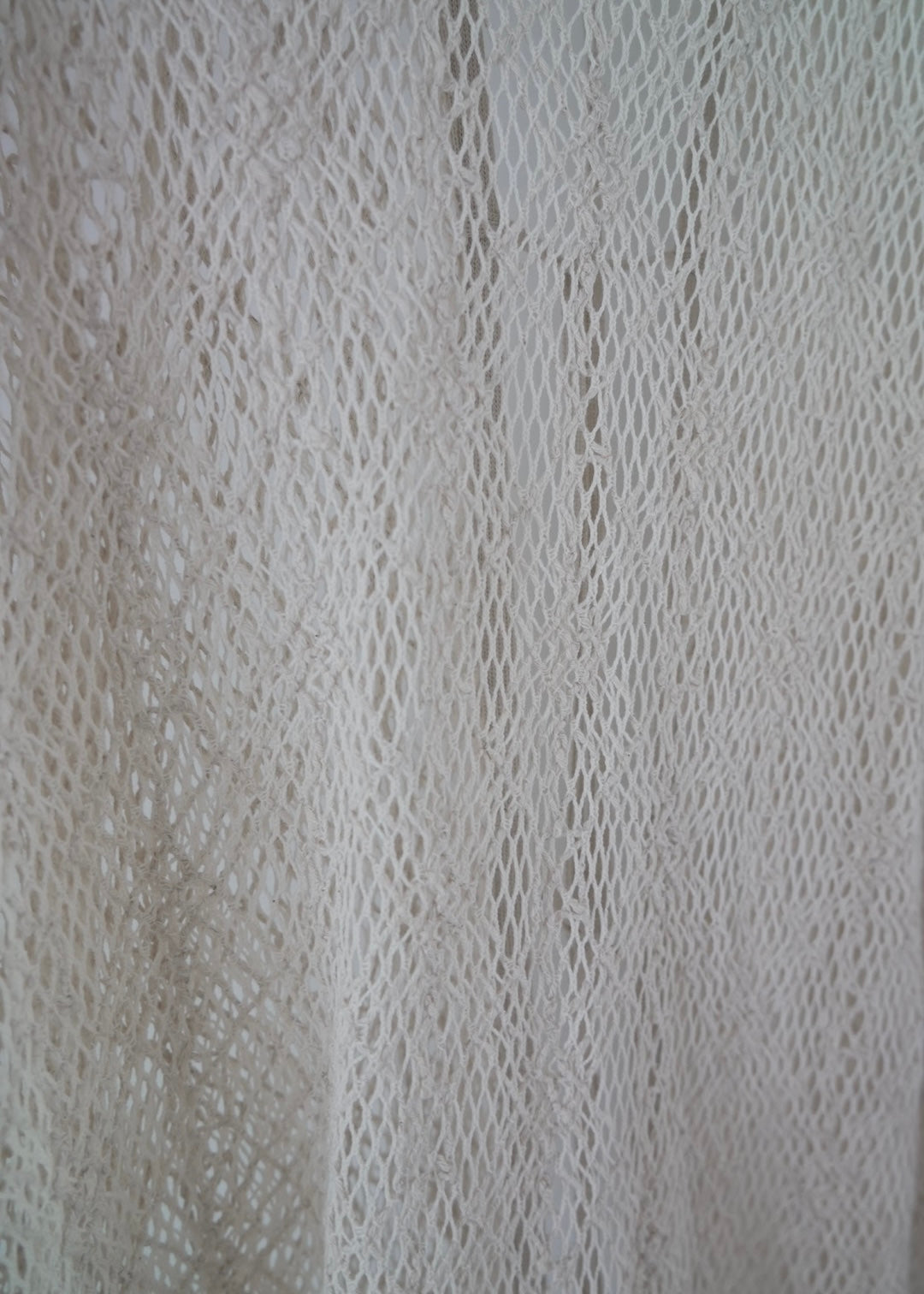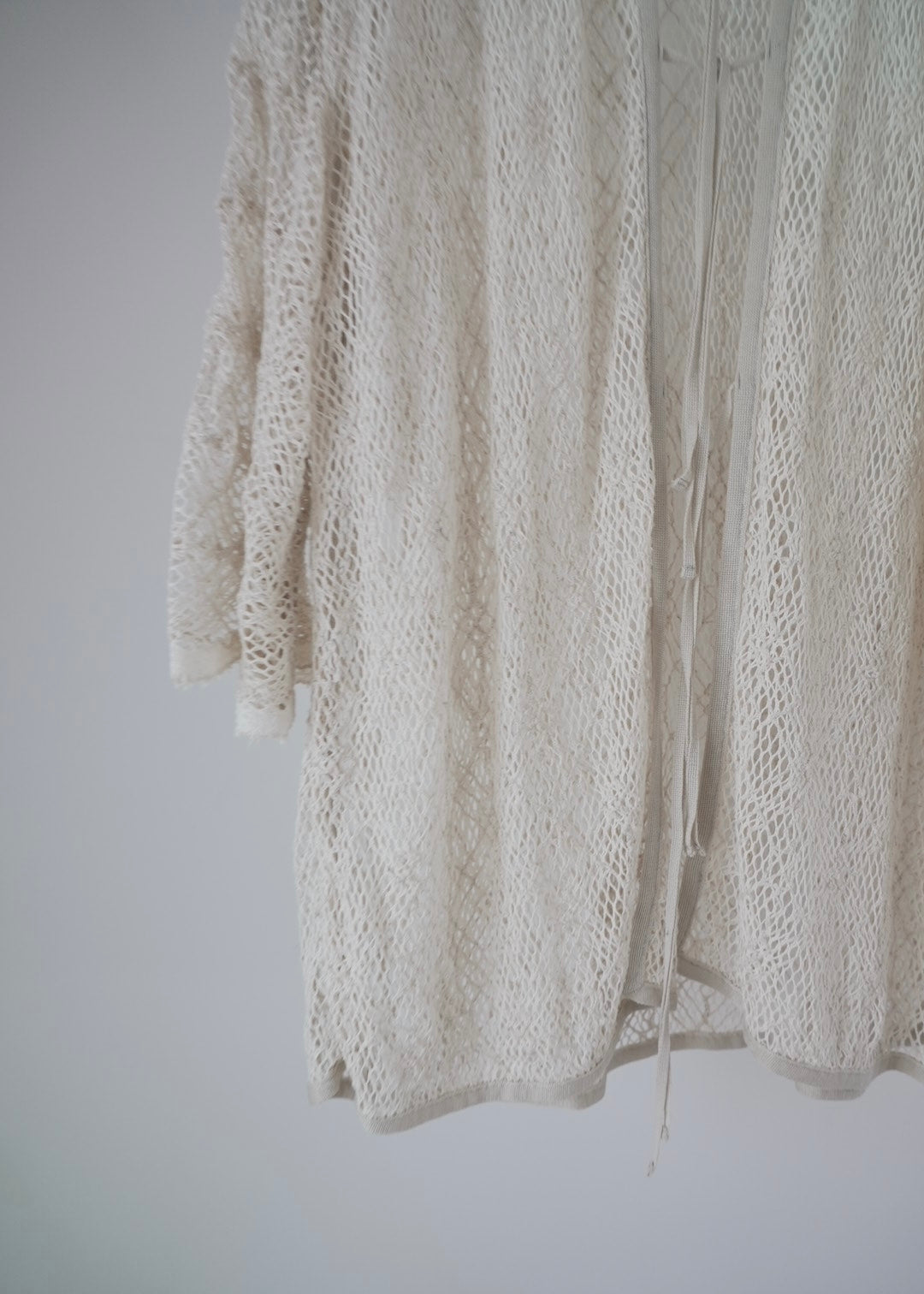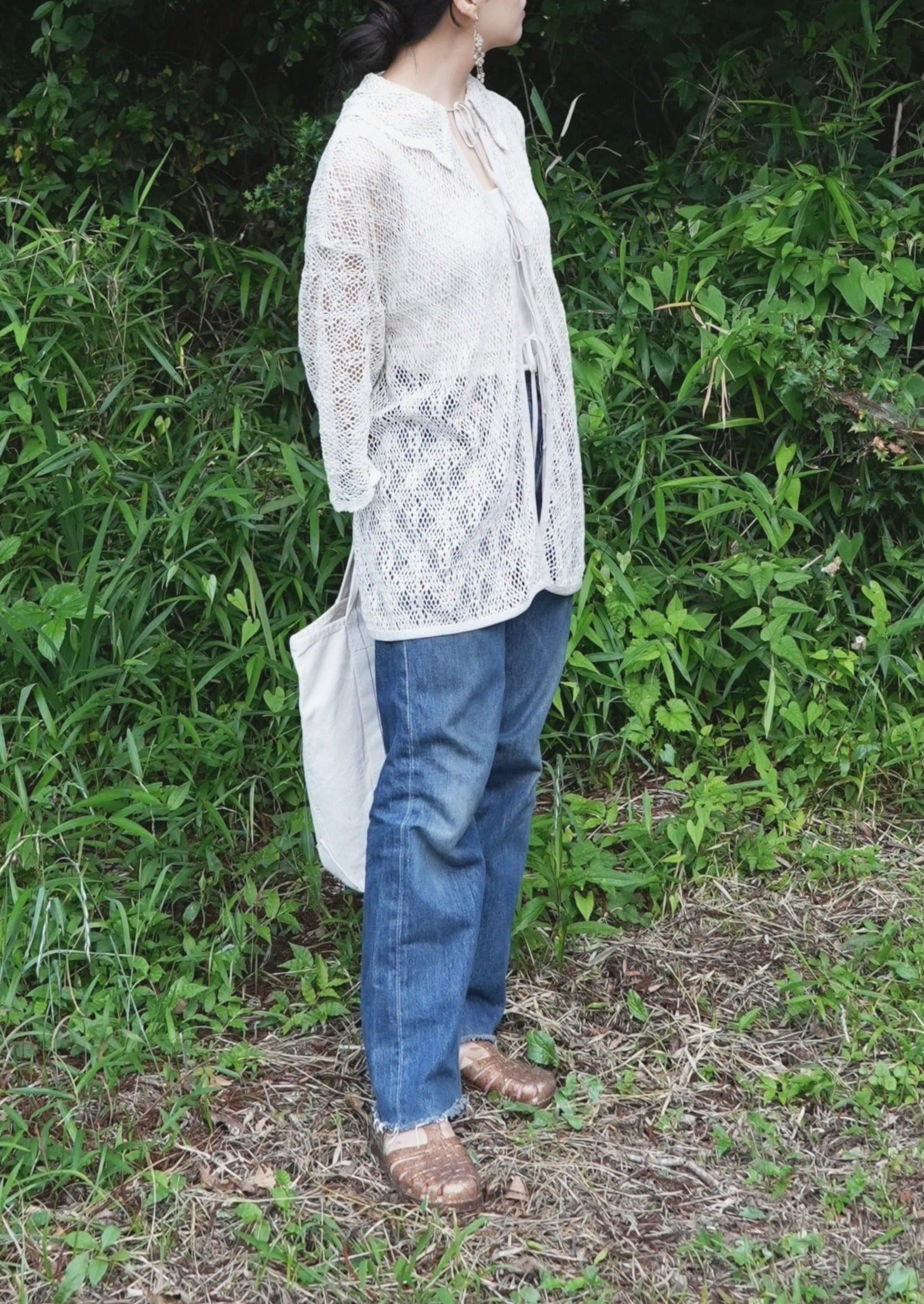 蕾絲採用不同粗細的紗線編織而成,賦予其棉麻獨有的自然紋理和立體感。衣領和袖口飾有手工切割的扇貝花邊。