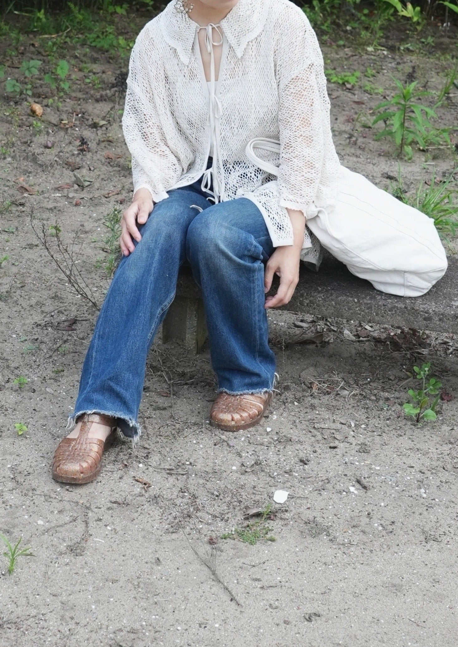 正面有三條針織絲帶。它可以作為襯衫或羽織來穿著。這個尺寸男士也可以穿。