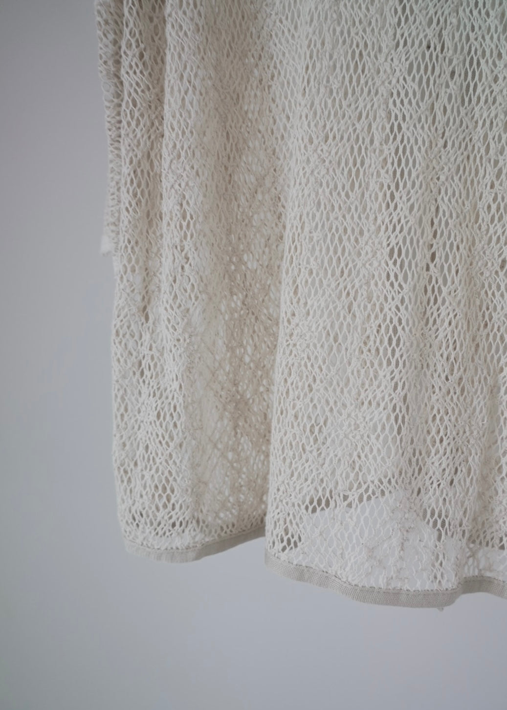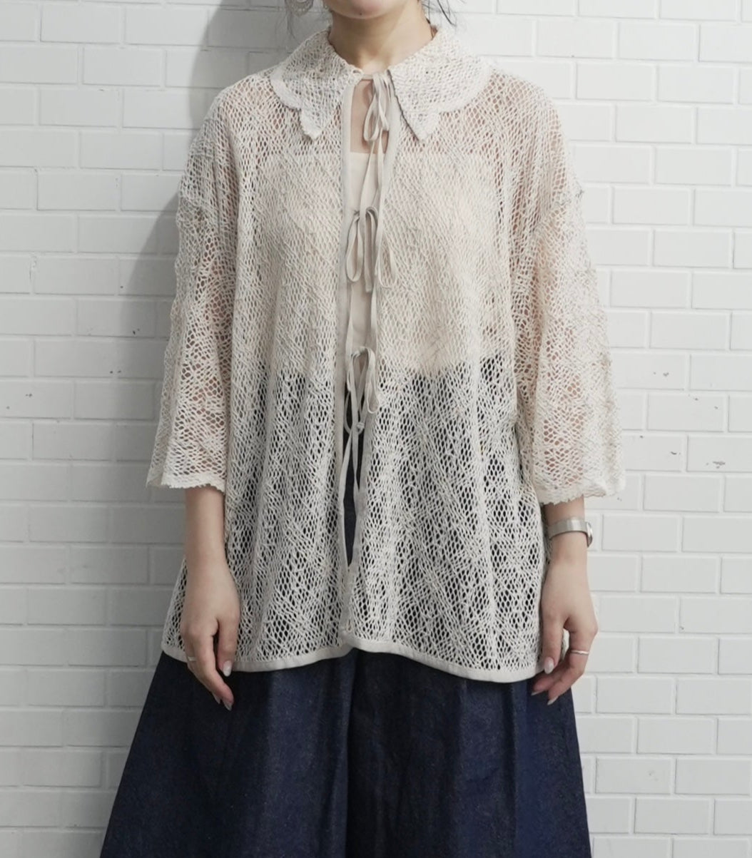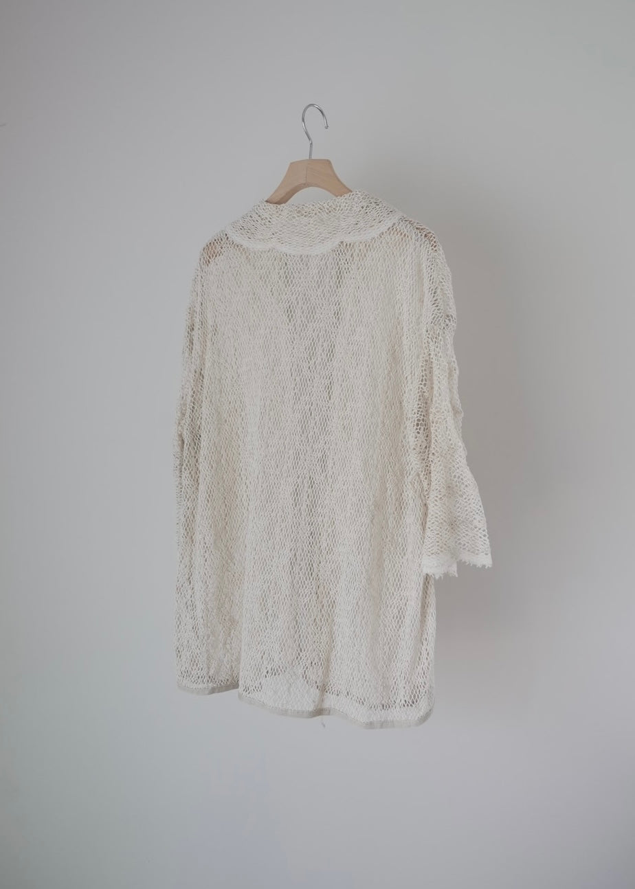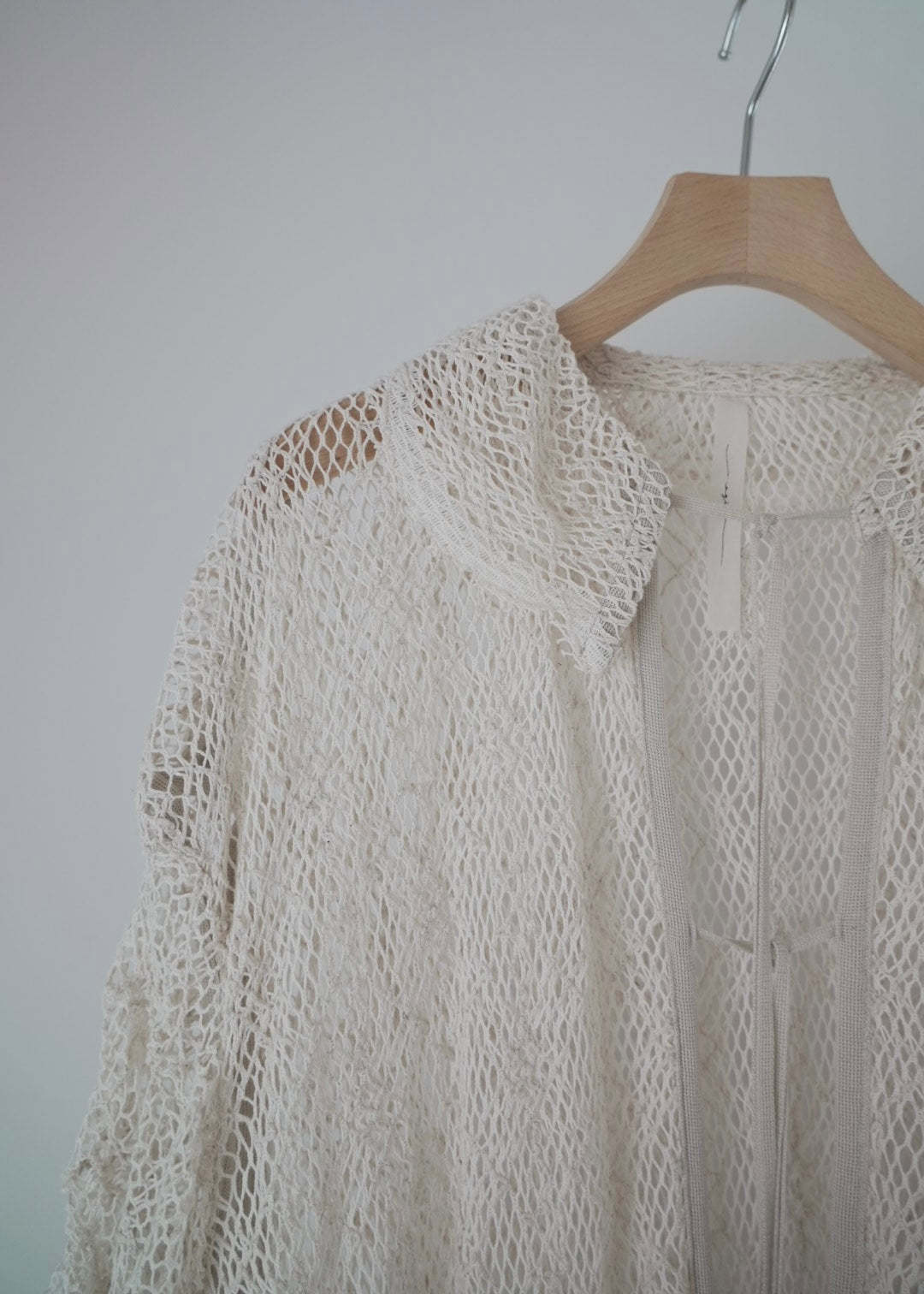 這件超大號襯衫採用低規格羅素蕾絲製成。這件連身裙的特點是扇形邊緣,類似於陶瓷的邊緣,這是本季的圖像來源。這是一款將扇貝的甜味與男性輪廓相結合的易於穿著的物品。