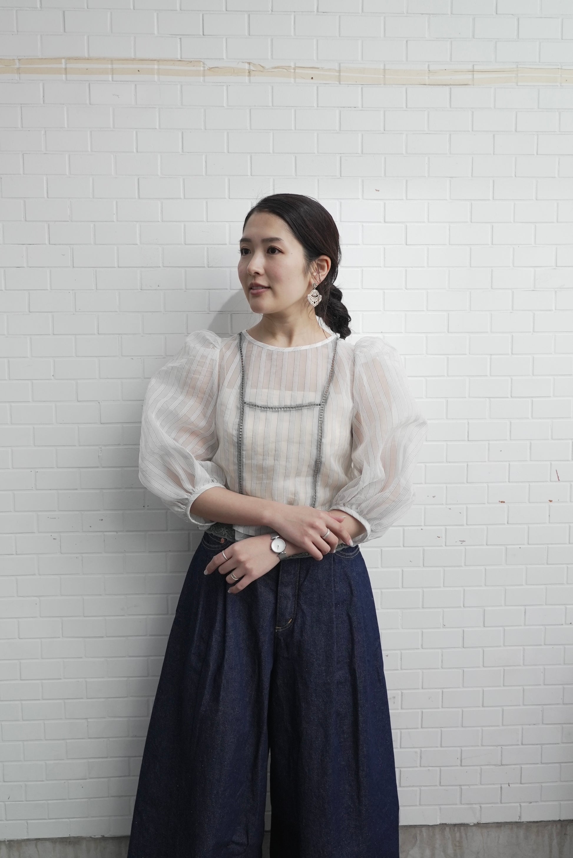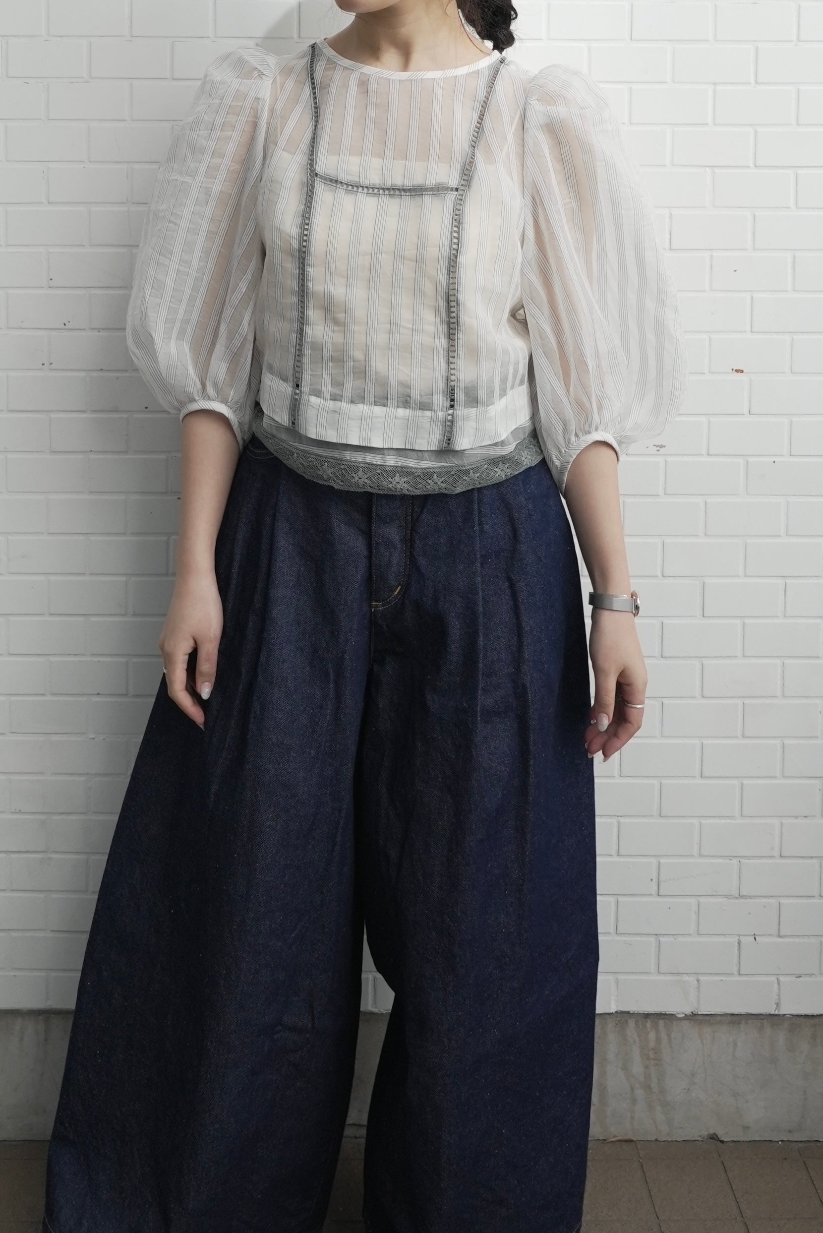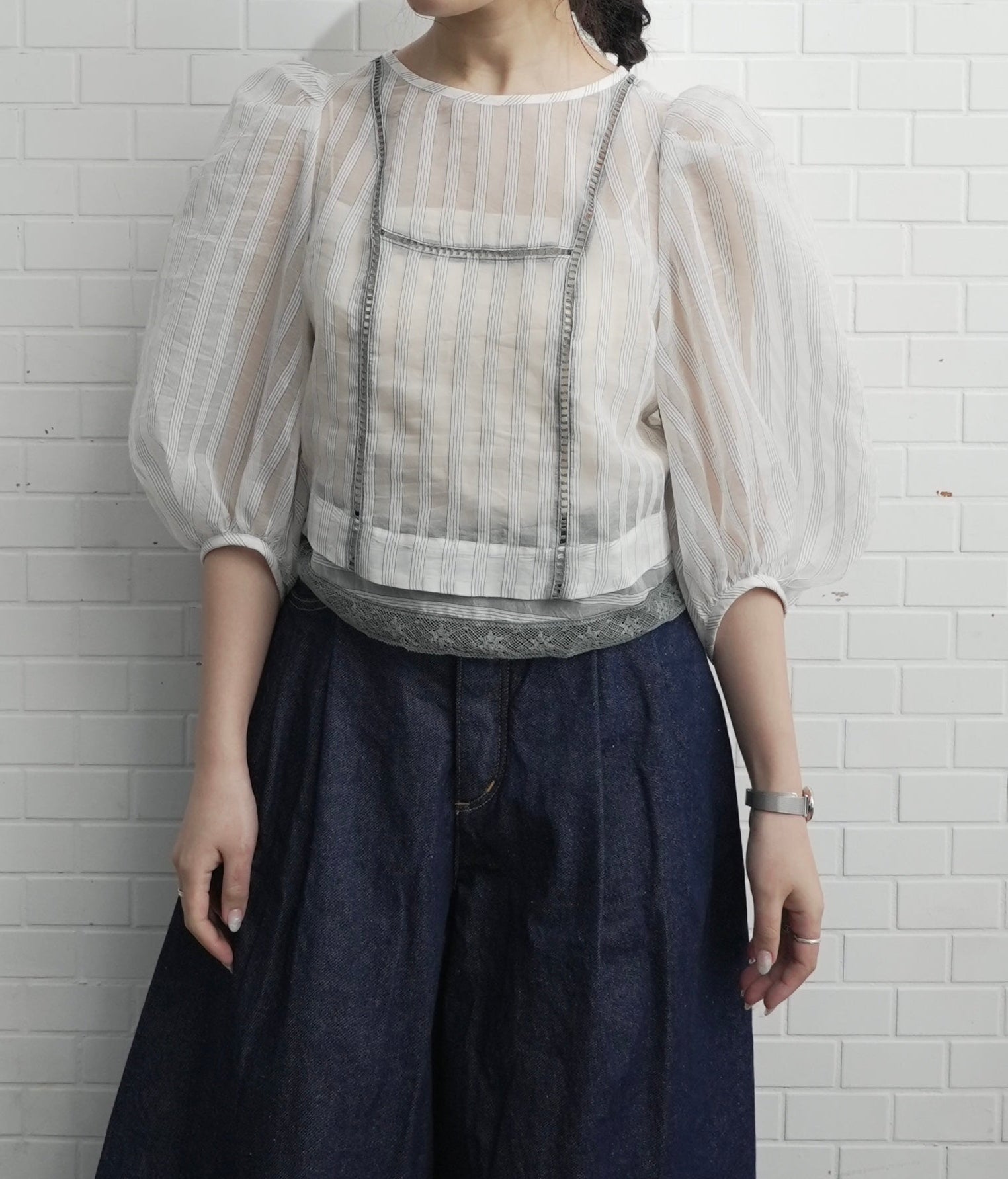 裸露的肌膚從前片和下擺的蕾絲縫隙中露出,寬大的泡泡袖更增添了體積感。條紋圖案賦予它甜美的外觀,適合日常使用到外出等各種場合。秋冬季節也可以內搭一些來穿。