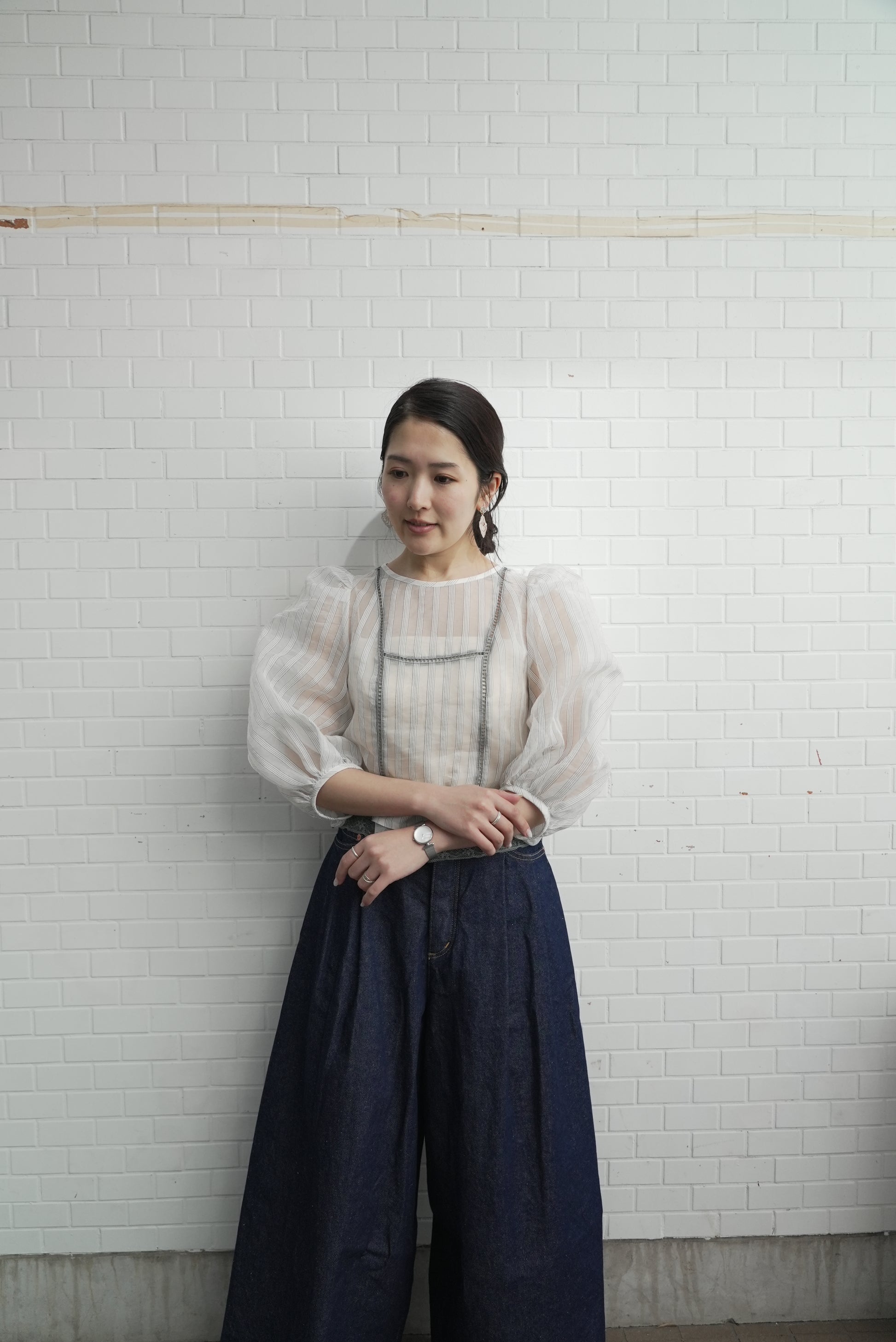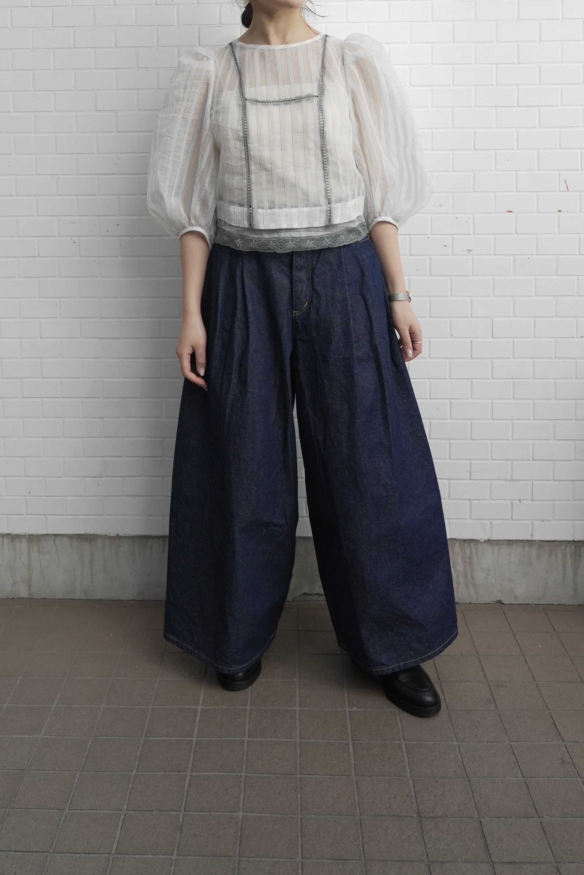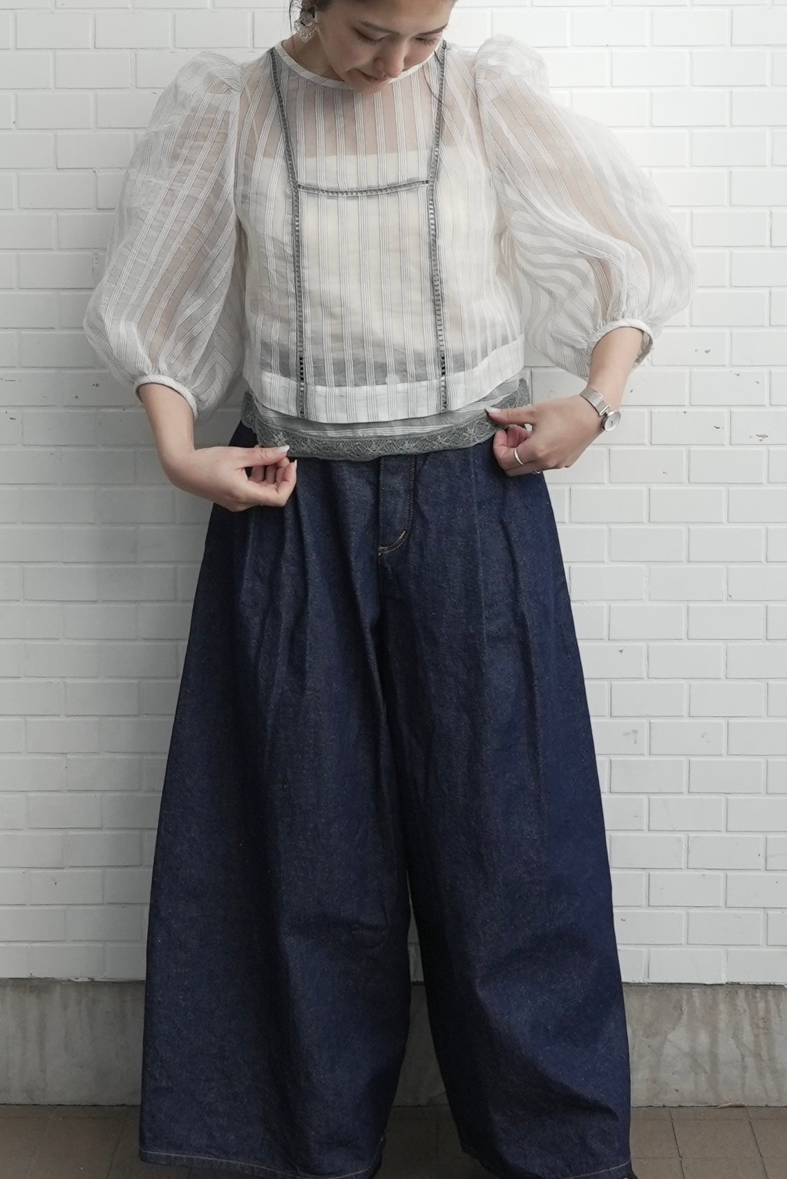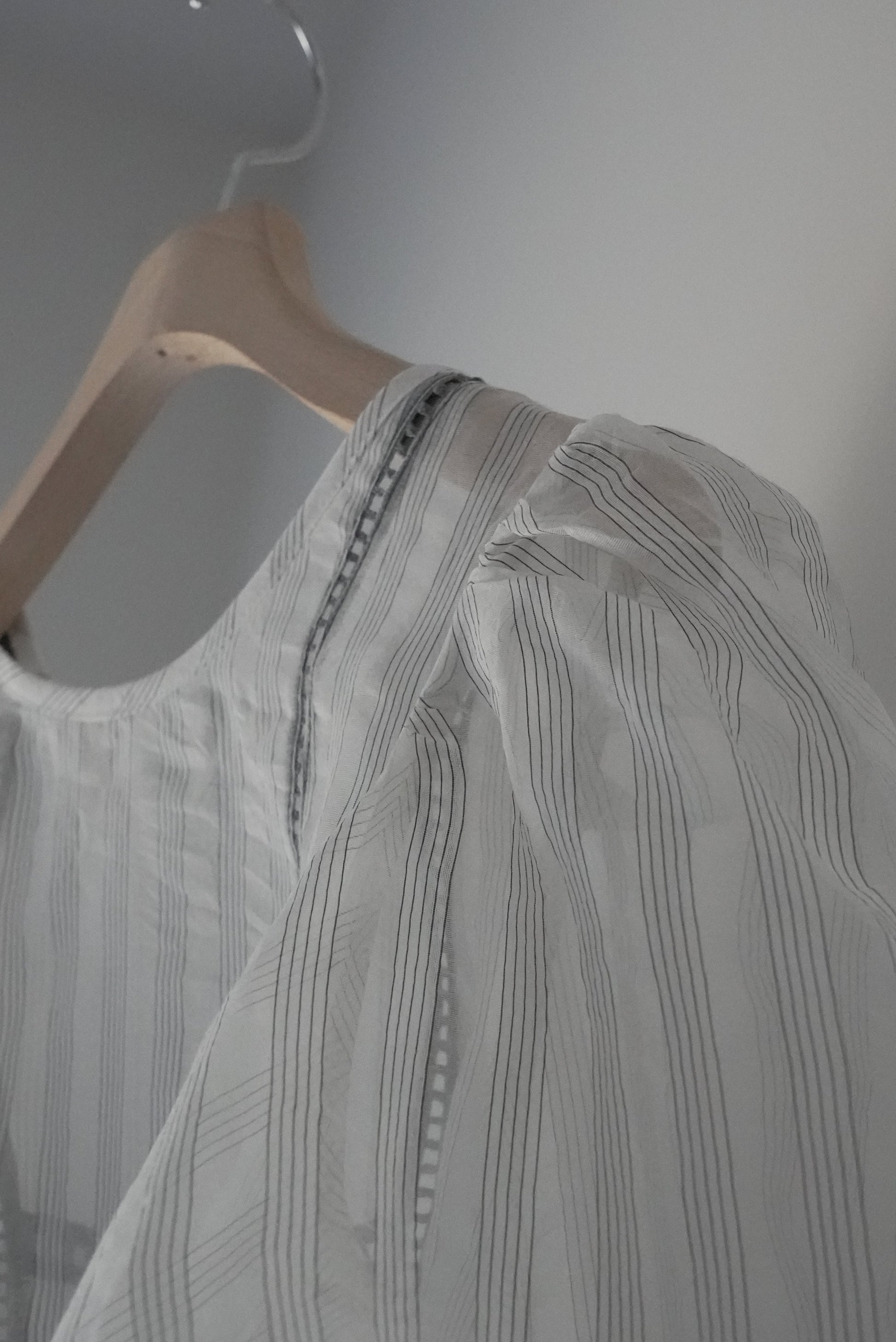 裸露的肌膚從前片和下擺的蕾絲縫隙中露出,寬大的泡泡袖更增添了體積感。條紋圖案賦予它甜美的外觀,適合日常使用到外出等各種場合。秋冬季節也可以內搭一些來穿。