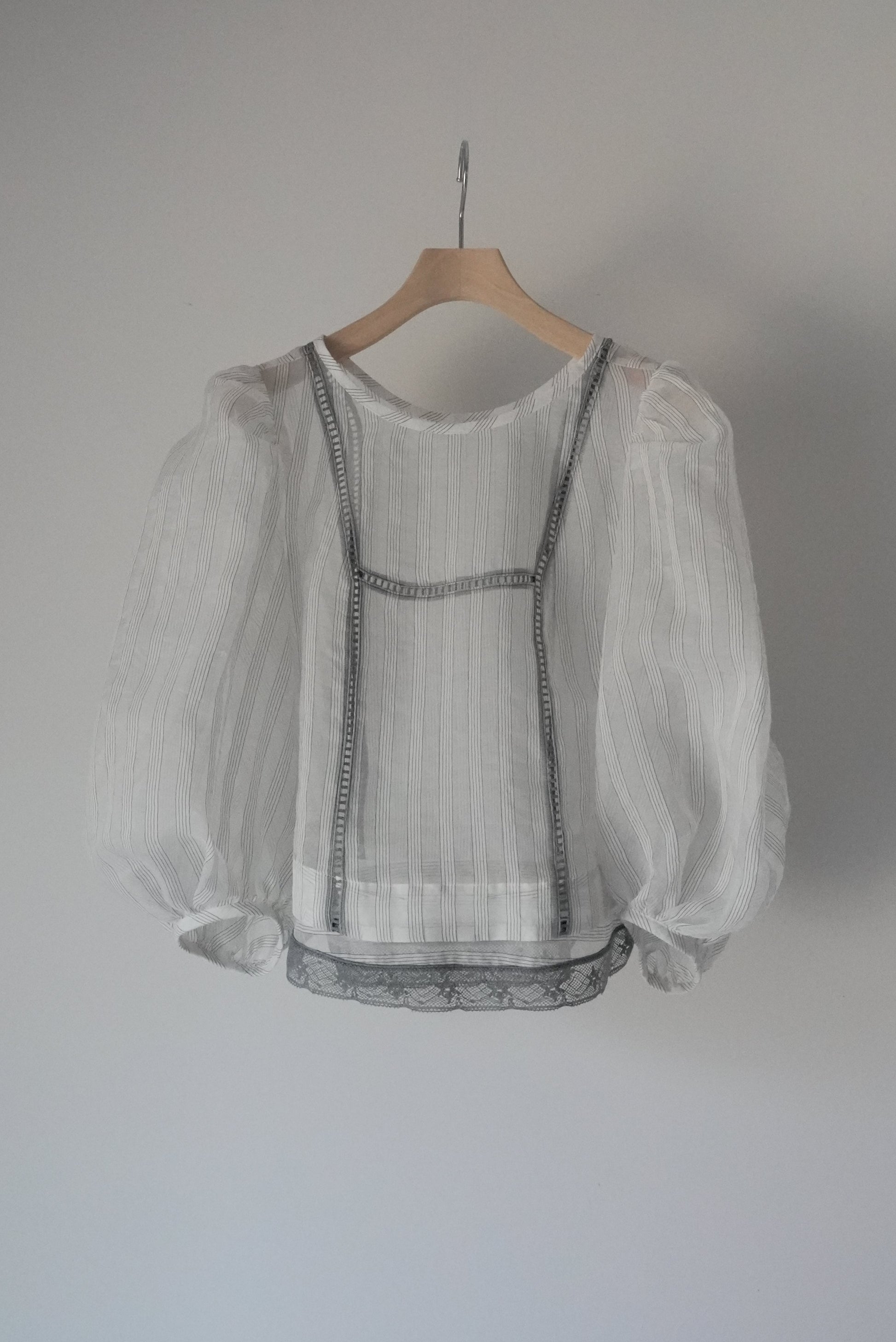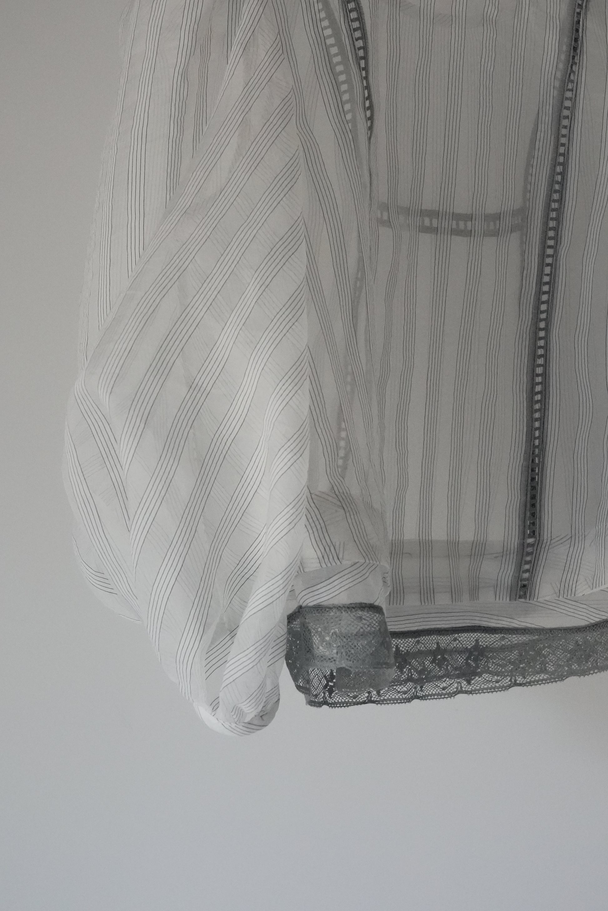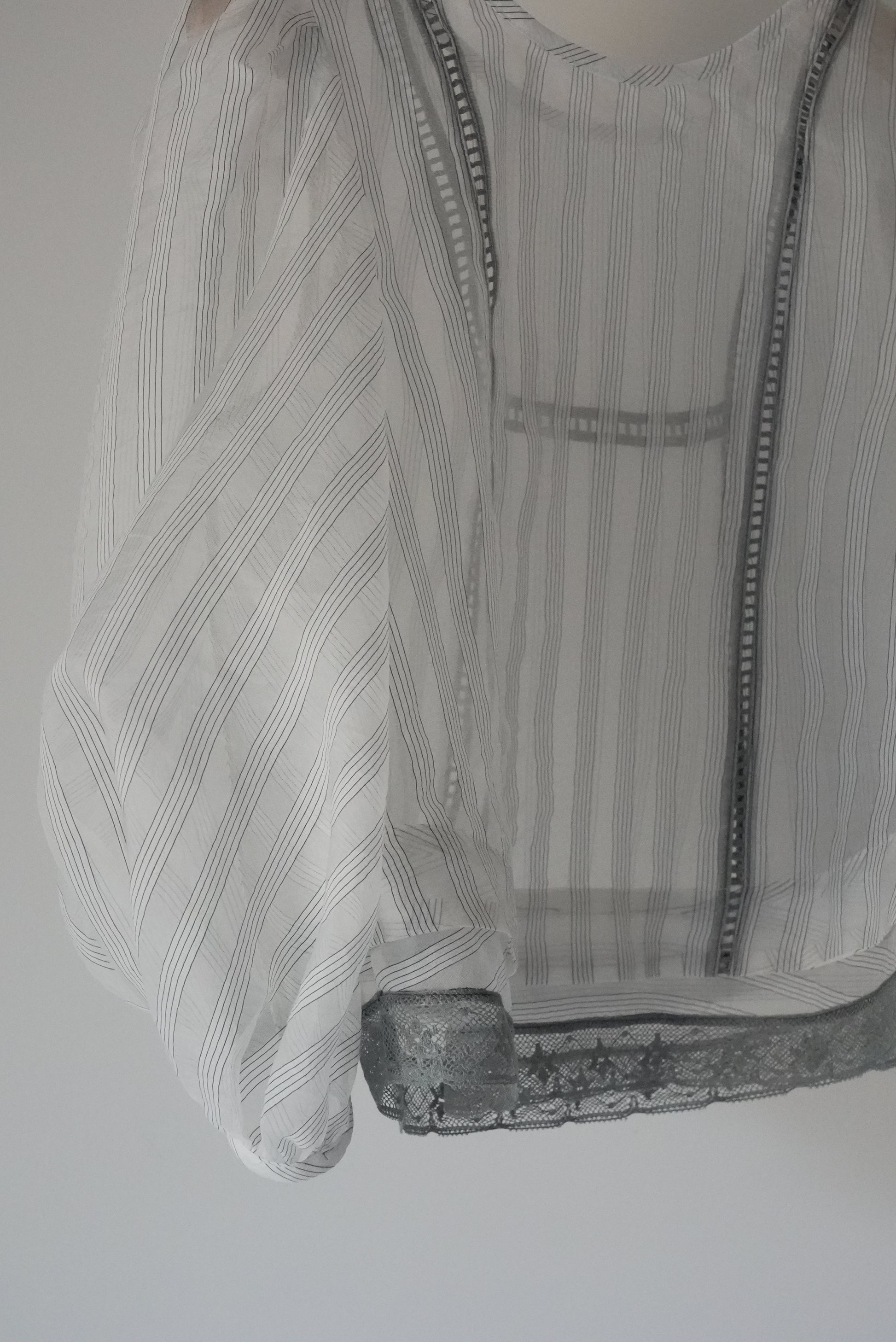 這件引人注目的襯衫採用絲綢條紋面料和棉質蕾絲製成。