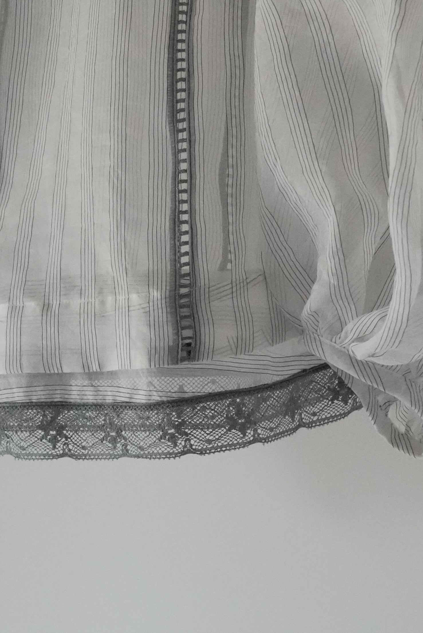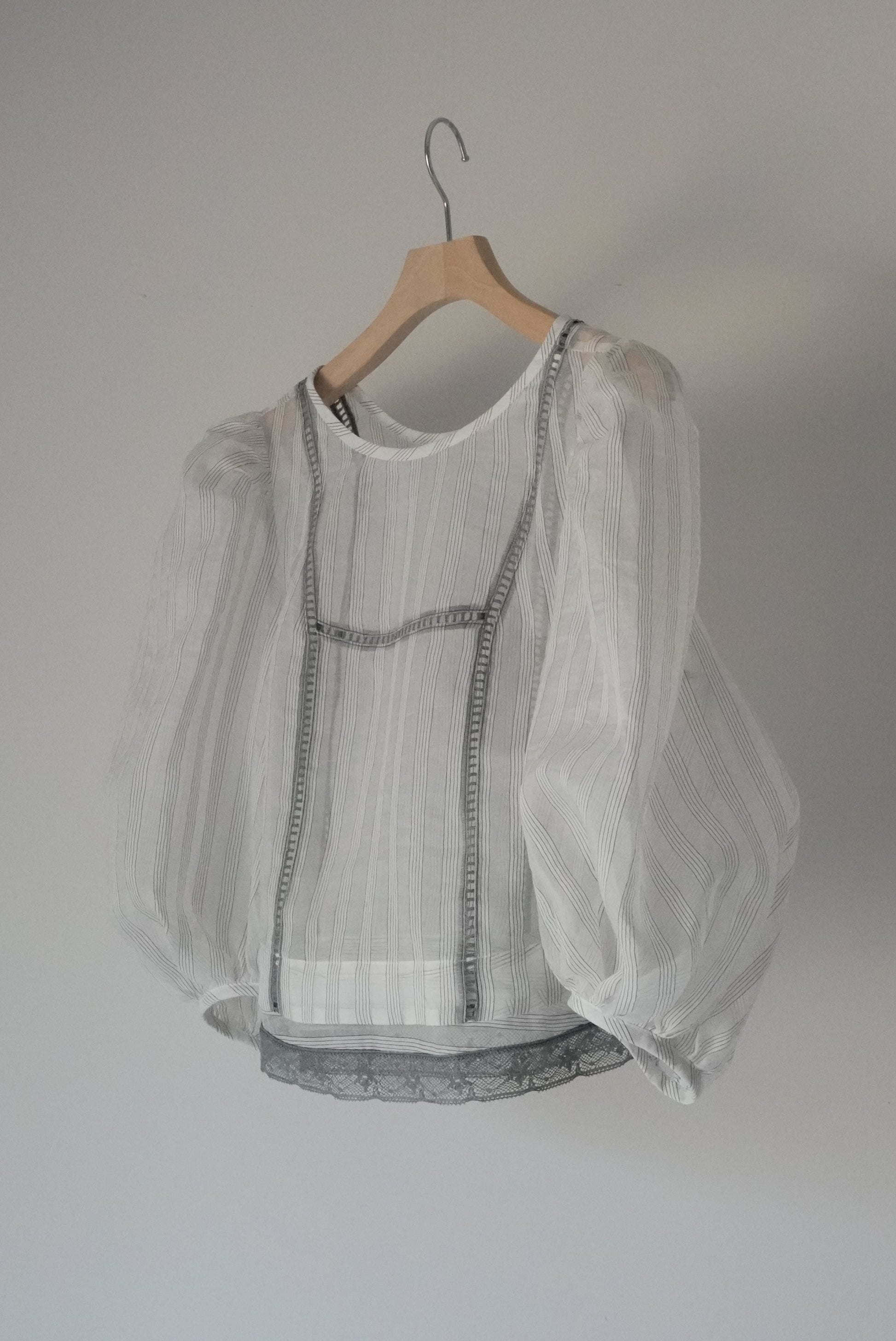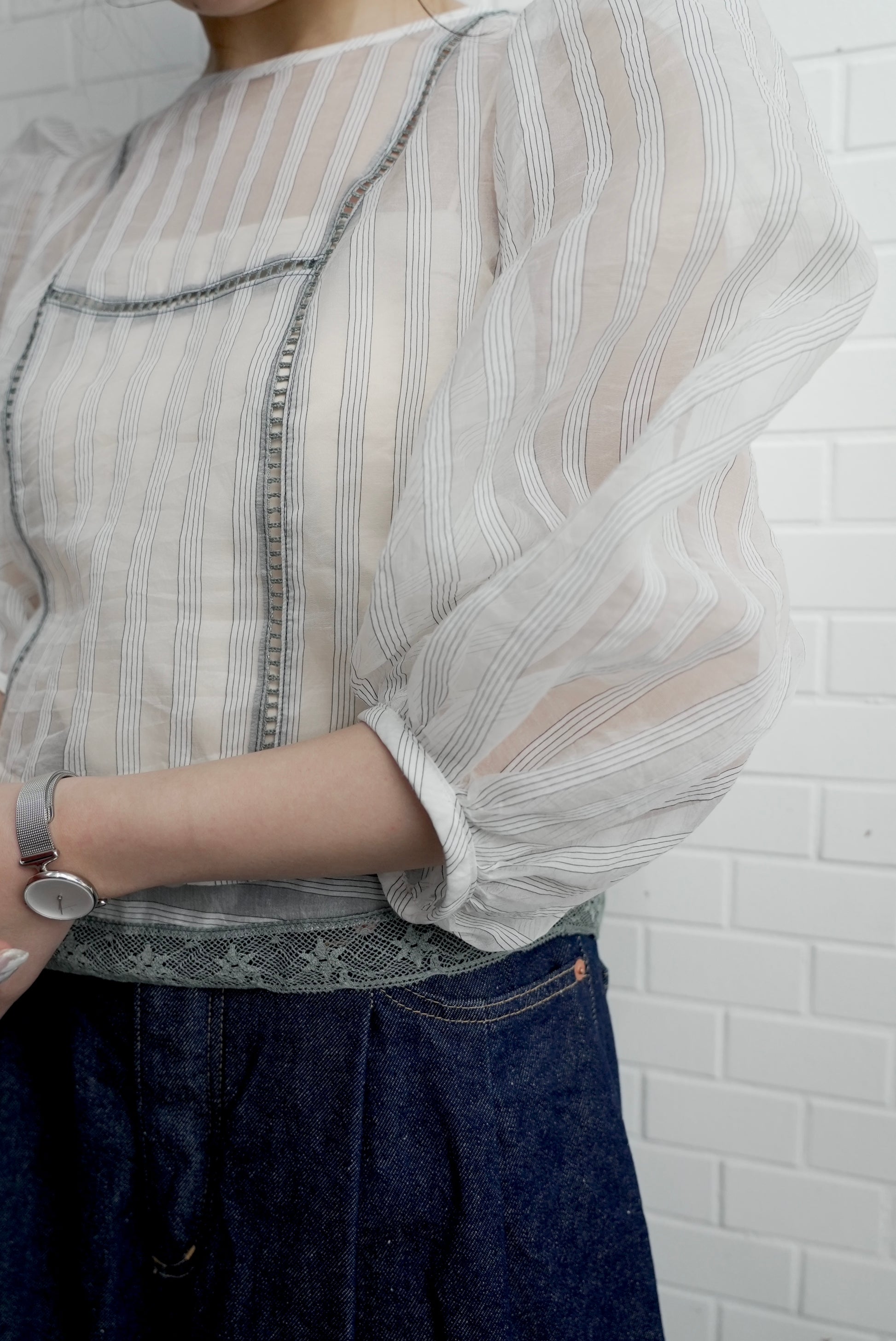 這件引人注目的襯衫採用絲綢條紋面料和棉質蕾絲製成。